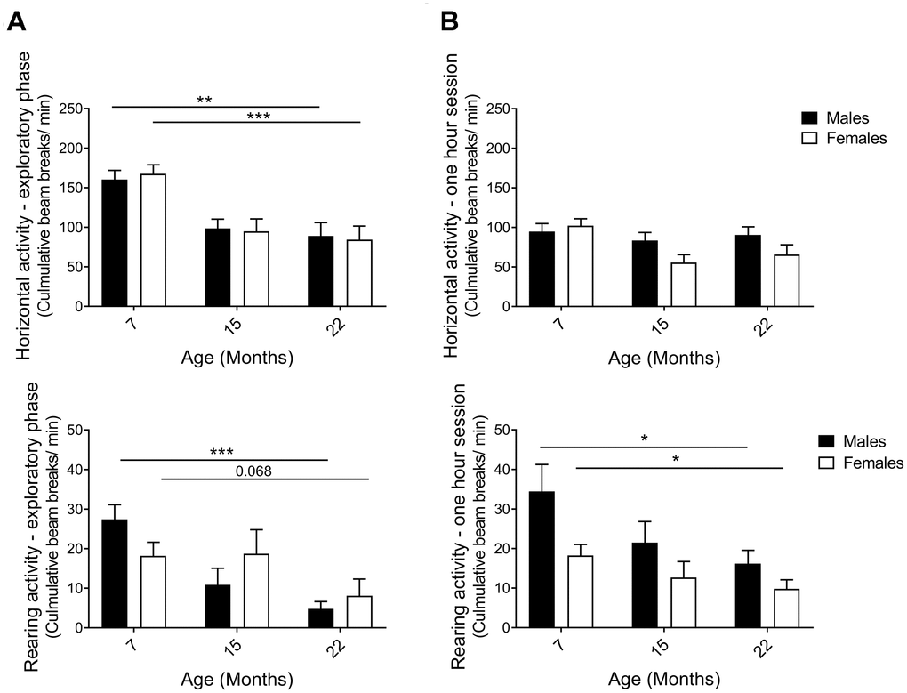 The activity box, an open-field test, was used to analyze horizontal and rearing activities of naïve hybrid female and male mice. A mouse standing on its hind limbs, termed rearing, is considered both exploratory and general vertical locomotor activity [46]. Data were separated into the first 5 minutes, representing the initial exploratory phase of the test, and the full one-hour to enable analysis of general activity and behavior in a more acquainted environment, also known as intrasessional (within session) activity. An age-effect was detected during the exploratory phase of the open-field session, with horizontal and rearing activity clearly declining from 7 to 22 months in both sexes (Figure 3A; horizontal pM7-22=0.0065, pF7-22=0.0006; rearing pM7-22=0.0003, pF7-22=0.0020). The one-hour test results demonstrated that horizontal activity did not change comparing the 7-month and the 22-month age groups of both males and females (Figure 3B; the activity was maintained through 15 months of age in males, while females exhibit an activity drop that may be caused by different handling of this particular group due to technical reasons, see Methods). Moreover, horizontal activity was found to decline within session as time elapsed in the open-field and the novelty of the environment decreased (Supplementary Figure 1A). Rearing activity over the full hour also declined with age in both males and females (Figure 3B; pF7-22=0.043, pM7-22=0.043). In contrast to horizontal activity, no differences in rearing within session were seen, i.e. no intrasessional changes (Supplementary Figure 1B). Thus, activity in the explorative phase was more significant and uniform in exhibiting an age-related decline than the activity during the longer sessions. Taken together, diverse exploratory behaviors decreased consistently with age in both sexes.
