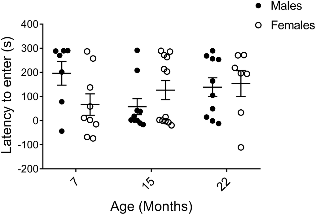 The shuttle box passive avoidance test is a two-day procedure to assay hippocampal and amygdala-dependent learning and memory through pain conditioning [25, 30, 47, 48]. On training day, mice were allowed to enter a dark compartment, which subsequently resulted in a small electric shock. On the following day, the difference in time to re-enter the dark compartment compared to the previous day was recorded as a measure of recollection of the unpleasant experience. In order to clearly illustrate the memory response, results are presented as time to enter on Day 2 subtracted by time to enter on Day 1. Although 7-month-old males tended to keep away from the avoidance-trained area the longest, indicating the best learning and memory of all groups, large individual variations were observed within the cohorts and no statistical significances were found. Thus, we unexpectedly found no trends of declining learning and memory with age in neither sex (Figure 4).