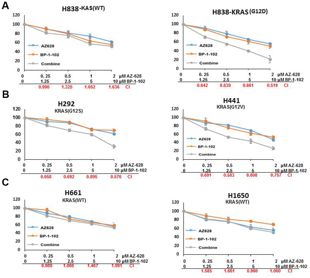 AZ628 is one of the inhibitors of RAF, and BP-1-102 is a STAT3 inhibitor. To evaluate the therapeutic effect of combined AZ628 and BP-1-102 on lung cancer cells, we analyzed the interaction (synergistic, additive or antagonistic) by calculating the combination index (CI). CI < 0.7 is considered as synergism; CI = 0.7–0.9 is moderate synergism; CI = 0.90–1.10 is nearly additive; and CI > 1.10 is antagonism. The cytotoxicity of combined AZ628 and BP-1-102 is enhanced in KRAS(G12D) H838 cells compared with KRAS(WT) H838 cells, and the CI values were < 0.7 in all groups with different concentrations combination, suggesting a strongly synergistic interaction between AZ628 and BP-1-102 in KRAS mutant lung cancer cells (Figure 1). In KRAS(G12S) H292 and KRAS(G12V) H441 cells which had KRAS mutation, the combination showed obvious synergism in some concentrations, whereas in other concentrations the drug effect was nearly additive. In contrast, antagonistic interaction between this combination drugs was observed in H661 and H1650 cells which were KRAS wild-type lung cancer cells. These findings indicated that KRAS mutant lung cancer cells might be selectively sensitive to combined AZ628 and BP-1-102.