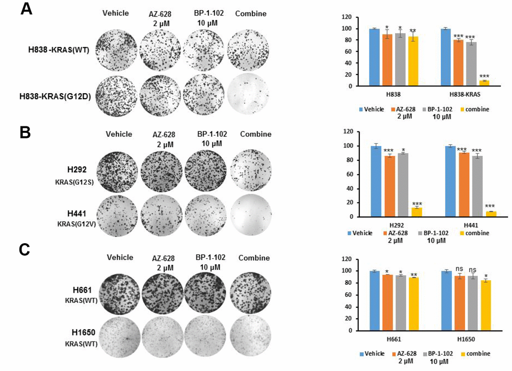 Cells were plated in 6-well plates and continuously incubated for 24 h. And then, cells were treated with DMSO or 2 μM AZ628 or 10 μM BP-1-102 or a combination of AZ628 and BP-1-102 for 7 days, and stained with crystal violet.