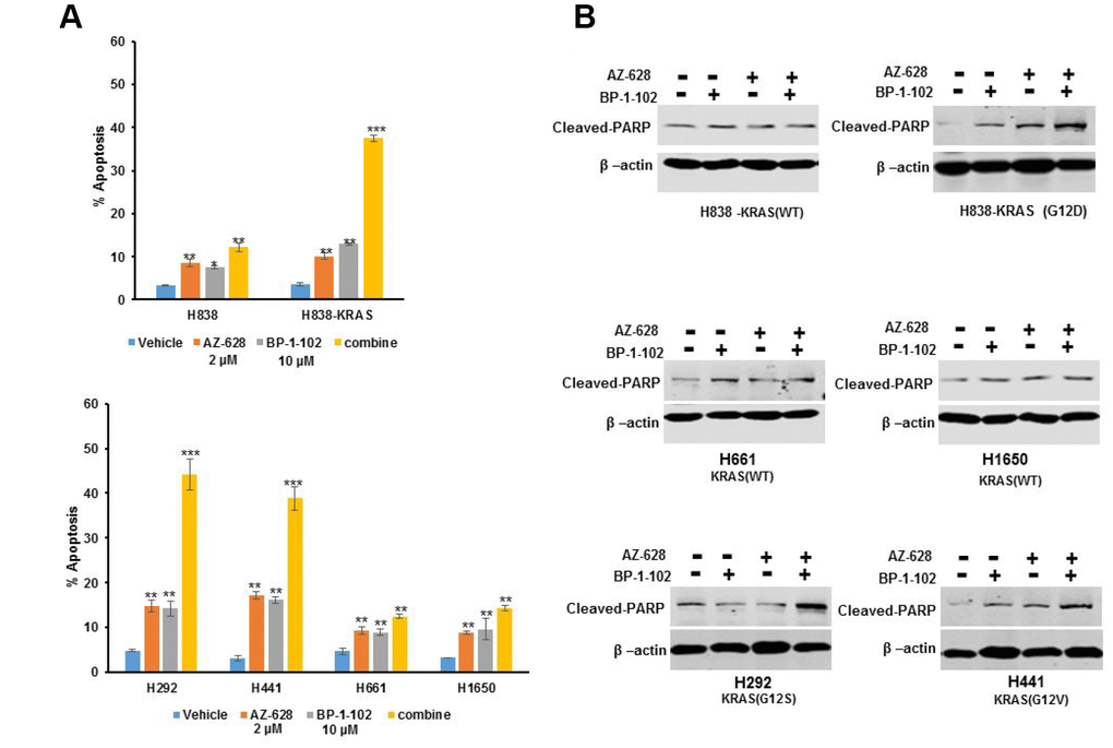 Cell apoptosis assays were performed with single inhibitor or a combination of AZ628 and BP-1-102 on a panel of KRAS mutant lung cancer cells and wild-type lung cancer cells. The results showed that single inhibitor also owned the ability to induce cell apoptosis in both KRAS mutant lung cancer cells and wild-type lung cancer cells (Figure 3A). However, KRAS(G12D) H838, KRAS(G12V) H441 and KRAS(G12S) H292cells showed far higher apoptotic response to the combination than to single inhibitor compared with KRAS(WT) H838, H661and H1650 cells.