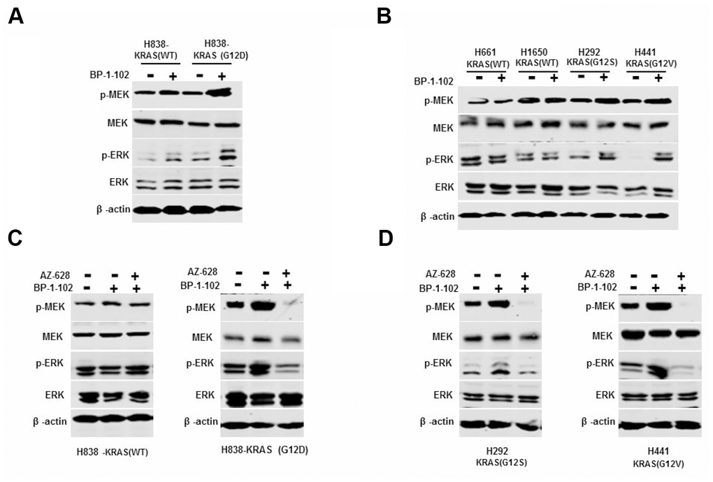 To investigate the mechanism underlying the effects of combined AZ628 and BP-1-102 on KRAS mutant lung cancer cells, we evaluated the role of these inhibitors in MEK/ERK signaling pathway. STAT3 has been reported to be an essential molecule in RAS oncogenic transformation [13]. This study showed that BP-1-102 markedly increased the protein levels of p-MEK and p-ERK in KRAS mutant cancer cells, suggesting that STAT3 inhibitor can result in MEK and ERK up-regulation. Interestingly, p-MEK and p-ERK expression were significantly inhibited when BP-1-102 combined with AZ628. Given the distinct pharmacological targeting profiles of AZ628 and BP-1-102, future work should also address how to impose the pharmacological effects of these two drugs in RAS-mutant cells?