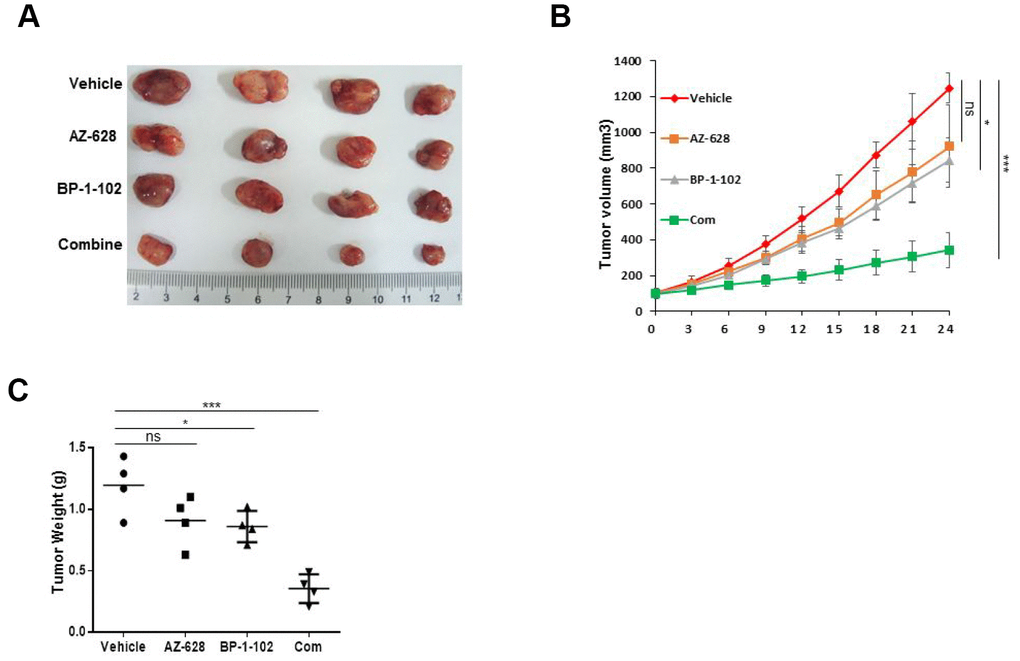 BALB/c nude Mice, 6–8 week old, were purchased from the SLAC Laboratory Animal Center (Shanghai, China), and were subcutaneously injected with H441 cells (5×106) in the right flank. And then, mice were divided into four groups treated with vehicle, AZ628, BP-1-102, and in combination, respectively. AZ628 was dosed at 20 mg/kg and BP-1-102 at 20 mg/kg. And then, mice were sacrificed. Tumor volume was detected by using a digital caliper.