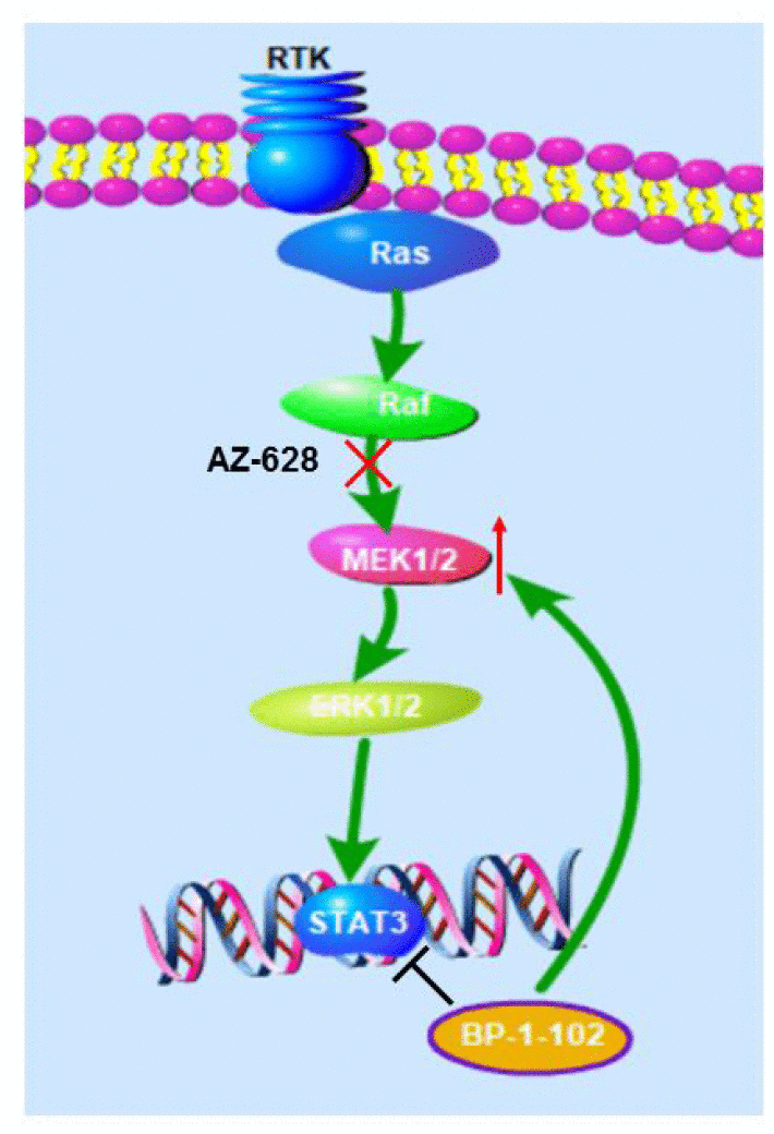 In summary, the current data support the pharmacological action mode that AZ628 and BP-1-102 combination inhibits RAS-mutant lung cancer cells by markedly abrogating MEK/ERK signaling pathway activation (Figure 6). Our new findings on the pharmacological effects of AZ628 and BP-1-102 combination on lung cancer cells may pave a new way to treat this refractory cancer.