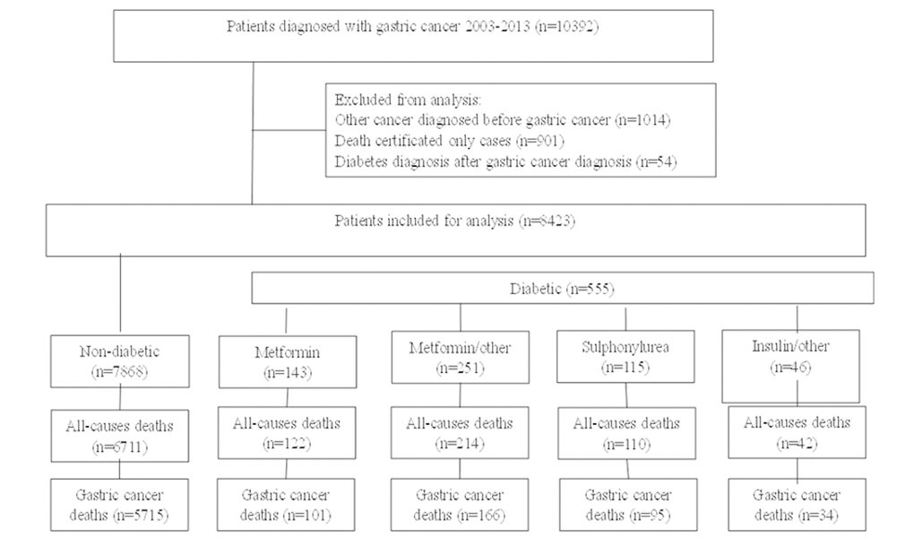 Patients were excluded from the cohort if they were identified as death certificated only cases, patients with malignancy prior to gastric cancer and cases with diabetes diagnosed after the diagnosis of gastric cancer. A flow chart outlining the selection of the cohort is presented in Figure 1.