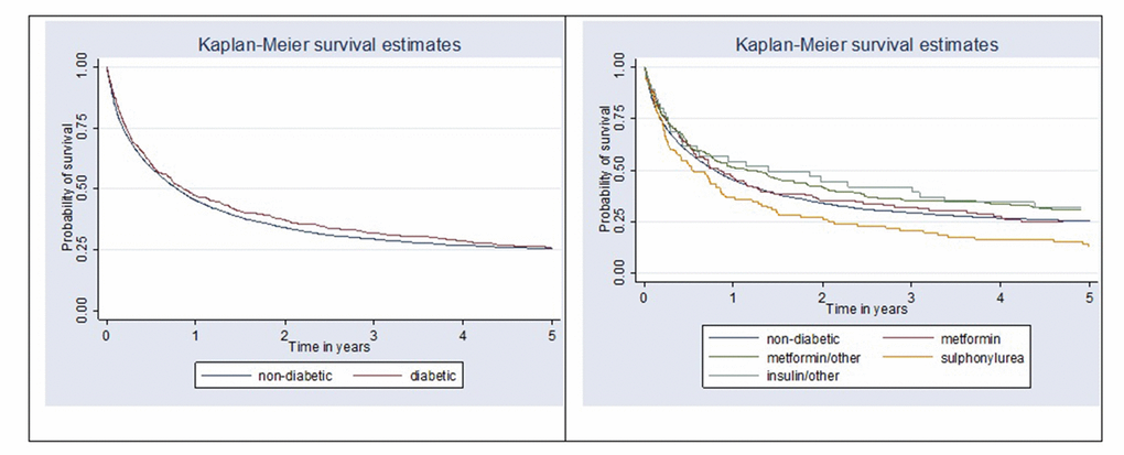 Kaplan-Meier survival analysis showed no differences for gastric cancer-specific survival between non-diabetic and diabetic patient groups. Cancer-specific survival analysis by antihyperglycemic medication user groups revealed strong evidence of survival difference between groups (p = 0.013). Better survival was observed in the groups of patients using antihyperglycemic medication combinations with metformin, metformin alone or insulin. Lowest survival (and lower than in non-diabetic patients) was observed in diabetic patients who were sulphonylurea users (Figure 2). Survival analysis comparing overall survival between non-diabetic and diabetic patients (p = 0.89) showed no evidence of survival difference between groups and survival differences between antihyperglycemic medication user groups were of borderline significance (p = 0.052) Figure 3.
