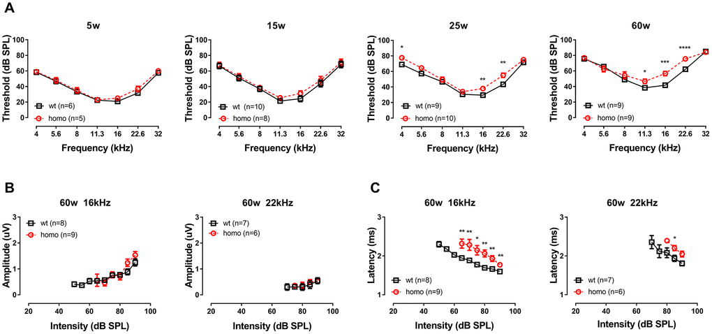 General ABR findings: KI mice exhibited late-onset progressive hearing loss with prolonged Wave I latency