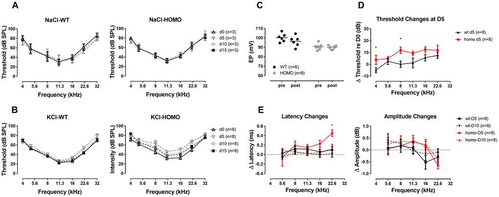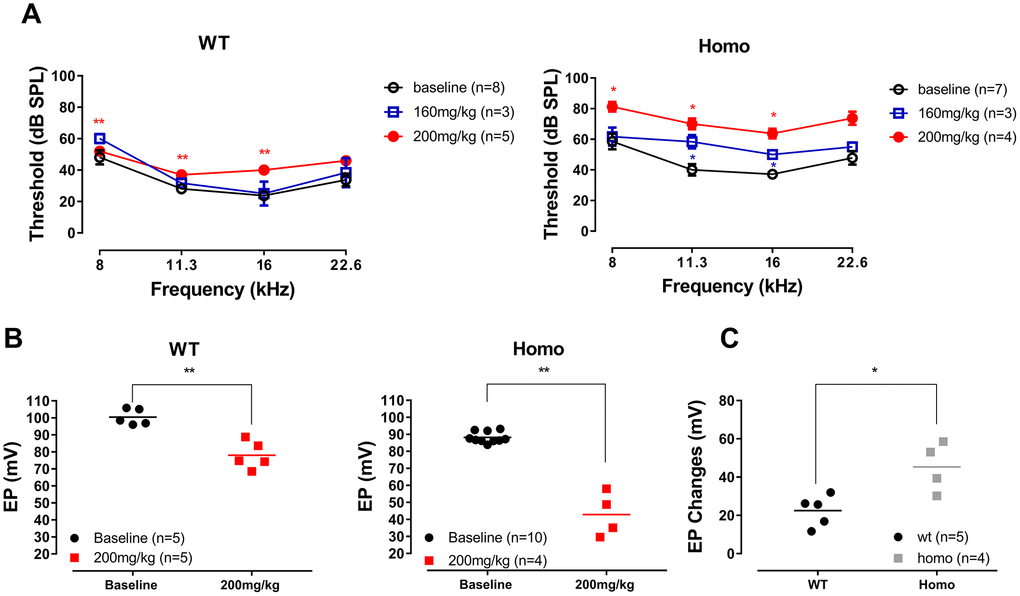 Age-matched male homozygous and wild-type mice were selected for the furosemide treatment. After anesthetized with chloral hydrate (480 mg/kg, IP) (Sigma Aldrich-Fluka, St. Louis, MO, USA), baseline ABRs were measured, followed by an intraperitoneal injection of furosemide (Sigma Aldrich-Fluka, St. Louis, MO, USA) of two different doses (160 mg/kg or 200 mg/kg). ABR thresholds at frequencies 8, 11.3, 16 and 22.6 kHz were monitored until the threshold elevations were stable (around 20 to 30 minutes after furosemide injection). Around 2 hours after furosemide injection, EPs were measured.