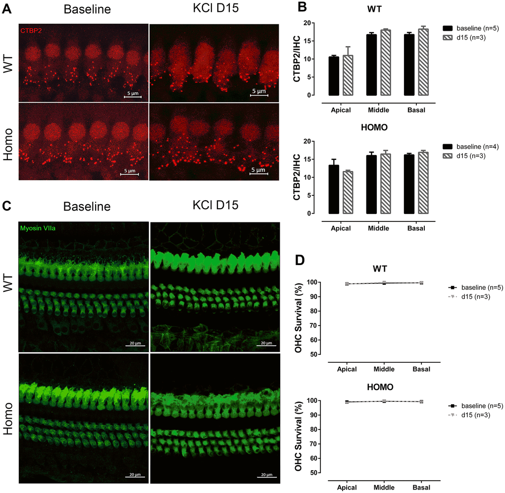 The excitatory toxicity to IHCs after noise exposure offered us a clue that cochlear pathology may arise from excessive potassium passage and extracellular accumulation, either from over-stimulating hair cells or from ineffective clearance due to attenuated GJ function [23, 62]. To test if homozygous mice have lower potassium clearance capability, we performed a one-time trans-tympanic injection of 150 mM KCl solution (150mM NaCl as control) into the middle ear cavity in 20 weeks old (from 18 to 22 weeks) animals. Neither wild-type nor homozygous mice responded to NaCl injection (Figure 10A, P>0.05 for both genotypes, two-way ANOVA followed by Bonferroni post-test), ruling out the impact of the procedure and Cl-. When given 150 mM KCl, the potassium ion permeated through the round window membrane served as K+ shock that stressed the recycling process. Post-injection ABR thresholds elevated in homozygous mice and almost recovered after 15 days (Figure 10B, P>0.05, two-way ANOVA followed by Bonferroni post-test). These changes were not EP derived because direct application of 150 mM KCl solution onto the round window did not reduce EP (Figure 10C, P>0.05, Student’s unpaired t-test with Welch’s correction). By comparing the ABR threshold changes at day 5, we found that homozygous mice had significantly larger shifts (Figure 10D, P=0.047, F(1,7)=5.814 and P=0.012, F(1,7)=11.332, for 4 kHz and 8 kHz, respectively, two-way ANOVA followed by Bonferroni post-test). Wave I analysis of homozygous mice also revealed prolonged latencies in high-frequency regions at day 5 (Figure 10E, left panel, P=0.011 and F(1,7)=11.727 at 22.6 kHz, two-way ANOVA followed by Bonferroni post-test), while amplitudes were unaffected (Figure 10E, right panel, P>0.05, two-way ANOVA followed by Bonferroni post-test). Although KCl injection could affect the Wave I latencies of homozygous mice, the number of synapses did not change at 15 days post-injection (Figure 11A, 11B, P>0.05, two-way ANOVA followed by Bonferroni post-test). No significant OHC loss was observed both in non-treated mice (baseline) and at 15 days after KCl injection (Figure 11C, 11D, P>0.05 between the two time points, two-way ANOVA followed by Bonferroni post-test). Taken together, we conclude that excessive potassium accumulation in perilymph was a risk factor in the development of pathology in Gjb2 mutation.
