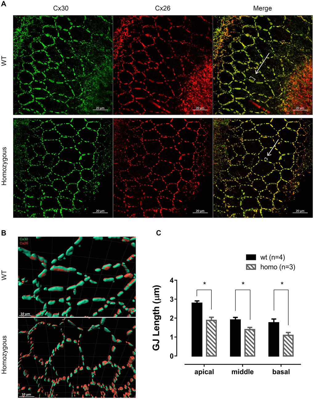 Cx26 and Cx30 are the most predominant form of GJs in the cochlea [30, 31]. The immunofluorescent staining of 60 week-old homozygous mice revealed honeycomb-like structures of GJs on the membrane of supporting cells (Figure 2A), where Cx26 precisely co-localized with Cx30 (Figure 2B). By measuring GJ plaques as indicated in Figure 2A, shorter averaged length of GJ plaques was found in homozygous mice (Figure 2C, P<0.05 in all the three turns, two-way ANOVA followed by Bonferroni post-test). This morphological change could have functional consequences such as reduced pore size, causing the reduction of the GJ permeability.