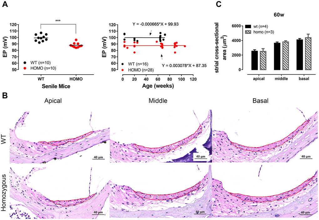 In some Gjb2 animal models, the characteristic phenotype was the hearing threshold elevation accompanied with EP drop [13, 25, 32–34]. Since GJs are believed to serve as ion diffusion shortcut among supporting cells [10, 35], we reasoned that the subtle morphological difference implied consequences in cochlear homeostasis that could eventually affect the generation of EP, as seen in Cx26 and Cx30 double mutation [13]. When we measured EP at the age of 60 weeks, homozygous mice exhibited a small (~12 mV) but significant reduction (Figure 3A, left panel, P <0.0001, t=5.876, df=16.6, Student’s unpaired t-test with Welch’s correction). To validate this observation, we extended our EP recordings to cover a wider age range and found that the difference of EP was consistent throughout the lifespan. The EP reduction was observed from the end of the third postnatal weeks when both EP and cochlear development just completed [36, 37], and the reduction persisted up to 100 weeks of age (Figure 3A, right panel, both P>0.05, linear regression). Cross-sectional H&E stainings showed no apparent morphology change in Stria Vascularis (SV) in homozygous when compared to the wild-type controls (Figure 3B, 3C, P>0.05, two-way ANOVA followed by Bonferroni post-test), ruling out SV atrophy as the source of EP reduction.