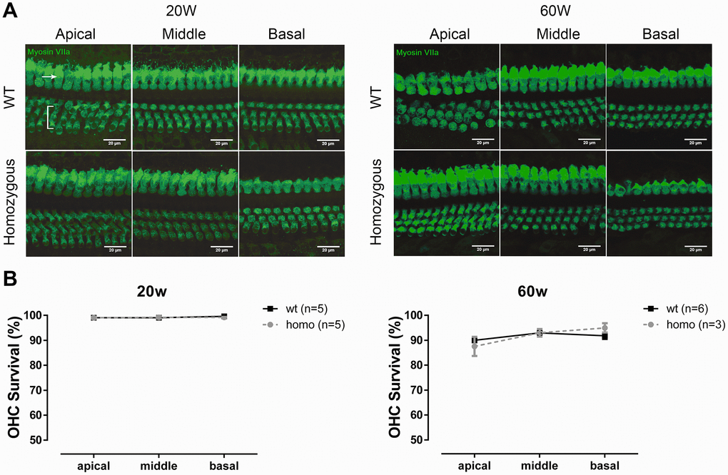 We first evaluated the cochlear morphology to quantify OHC loss. The sensory epitheliums of all three turns were collected at both 20 and 60 weeks for confocal imaging. Increased OHC loss was detected in the older age groups, but the extent of OHC losses were comparable between the two genotype groups at all three turns measured (Figure 4A, 4B, all P>0.05, two-way ANOVA followed by Bonferroni post-test), thus ruling out the loss of OHCs as the source of observed hearing phenotype.