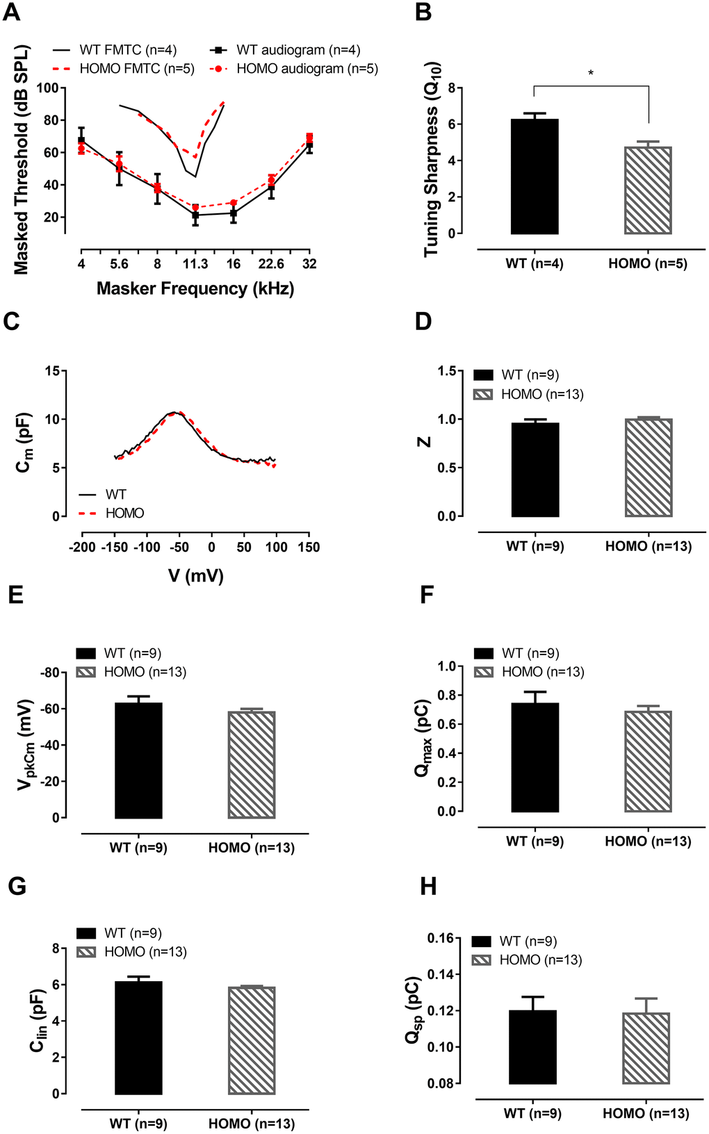 We then evaluated the function of the cochlear amplifier by acquiring forward masking tuning curves (FMTC), a non-invasive approach substituting single auditory nerve fiber recording [41–44] for estimating OHC function and cochlear amplifier’s integrity. We chose 11.3 kHz as the probe frequency since this was one of the most sensitive frequencies. When tested in the 20 weeks old animals, no significant tip threshold difference, in line with the ABR threshold measurement, was found between two genotypes (Figure 5A, P>0.05 for ABR thresholds at all frequencies, two-way ANOVA followed by Bonferroni post-test; P>0.05 for tip thresholds of FMTC, Student’s unpaired t-test with Welch’s correction). Q10, also known as the sharpness of tuning and an indicator of cochlear amplifier function, was significantly reduced in the homozygotes (Figure 5B, *P= 0.0204, Student’s unpaired t-test with Welch’s correction), suggesting that the cochlear amplifier was indeed affected [45]. The tails of the tuning curves were virtually overlapping, indicating normal passive mechanics in homozygous cochleae.