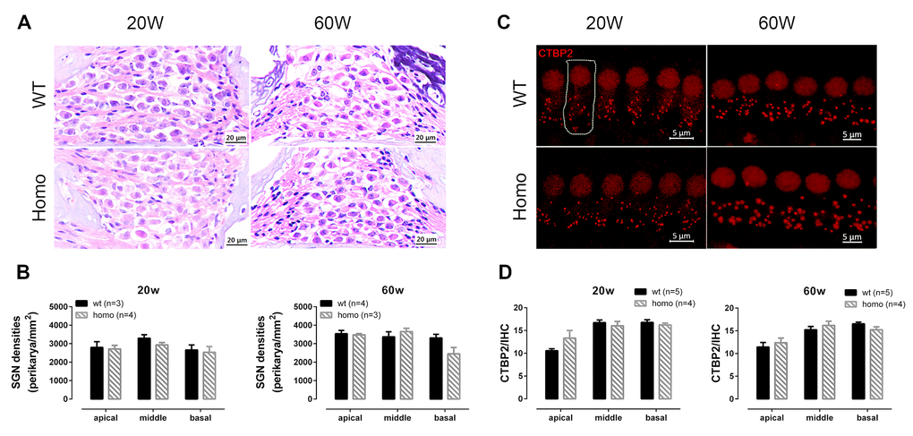 Midmodiolar sections were stained with H&E, and images were analyzed using software ImageJ (Wayne Rasband, National Institutes of Health, Bethesda, Maryland, USA). The SGN density in Rosenthal’s canal of every turn was counted by calculating the number of SGNs per um2. Morphology of stria vascularis was evaluated by measuring the cross-sectional area of each turn.