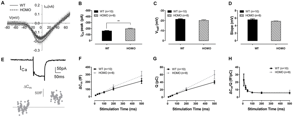 Since prolonged latencies of ABR wave I were found in homozygous animals, we hypothesized that the synaptic transmission and nerve conduction between IHC and spiral ganglion neuron (SGN) might have been altered. H&E stainings showed no significant changes in SGN density between homozygous and wild-type mice at both 20 and 60 weeks of age (Figure 6A, 6B, all P>0.05, two-way ANOVA followed by Bonferroni post-test), excluding SGN as the underlying source of pathology. For the IHCs, we used confocal imaging for CTBP2 staining to assess changes of ribbon synapses. Quantified puncta of CTBP2 showed no difference between homozygous and wild-type mice at both 20 and 60 weeks (Figure 6C, 6D, all P>0.05, two-way ANOVA followed by Bonferroni post-test). Although there was no quantitative change in IHC ribbon synapses, the function of IHC could still have changed. To further evaluate IHC functions, we used whole-cell patch-clamp recording to measure their calcium current and exocytosis. We first applied voltage ramps to IHCs and recorded the calcium current. Results showed significantly larger calcium current (Figure 7A, 7B, P=0.0091, t=2.978, df=15.49, Student’s unpaired t-test with Welch’s correction) with normal Vhalf and slope (Figure 7C, 7D, both P>0.05, Student’s unpaired t-test with Welch’s correction) in homozygous IHCs. We then applied voltage steps to induce exocytosis and measured whole-cell capacitance before and after stimulation. We found that neither the capacitance change (ΔCm) nor the ratio of ΔCm and the Ca2+ charge (ΔCm/Q) showed significant difference between the two genotypes (Figure 7F–7H, all P>0.05, two-way ANOVA followed by Bonferroni post-test), indicating that per vesicle release was unaffected.