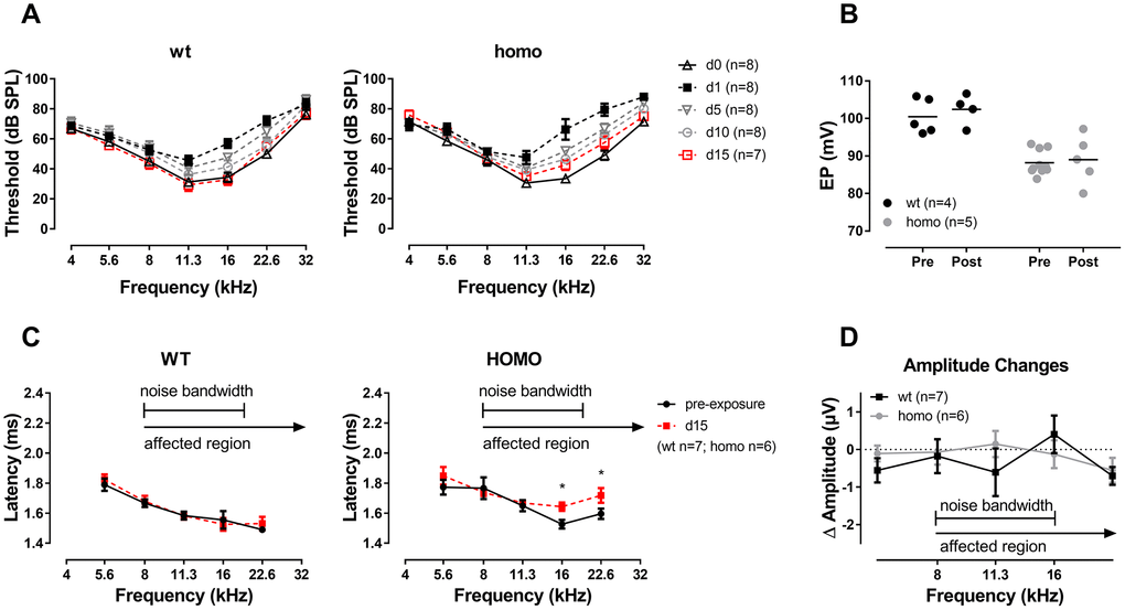 Mice were anesthetized with chloral hydrate (480 mg/kg, IP) (Sigma Aldrich-Fluka, St. Louis, MO, USA) to test the baseline ABR (pre-exposure) and then placed into a custom made wire cage on a heating pad (Harvard Apparatus, 55-7020) with the temperature maintained at 37°C. A free-field MF1 speaker positioned 10 cm away from the vertex of the mice presented an 8-16 kHz band-pass noise generated by the RZ6 workstation (Tucker–Davis Technologies, Alachua, FL, USA). Noise exposure was performed at 100 dB SPL for two hours. ABRs were repeated at before noise exposure (day 0) and at day 1, 5, 10 and 15 after noise exposure. ABR waves were analyzed on day 0 and day 10. Post-exposure latencies and amplitudes were compared between two genotype groups (subtracting levels of day 10 from day 0).