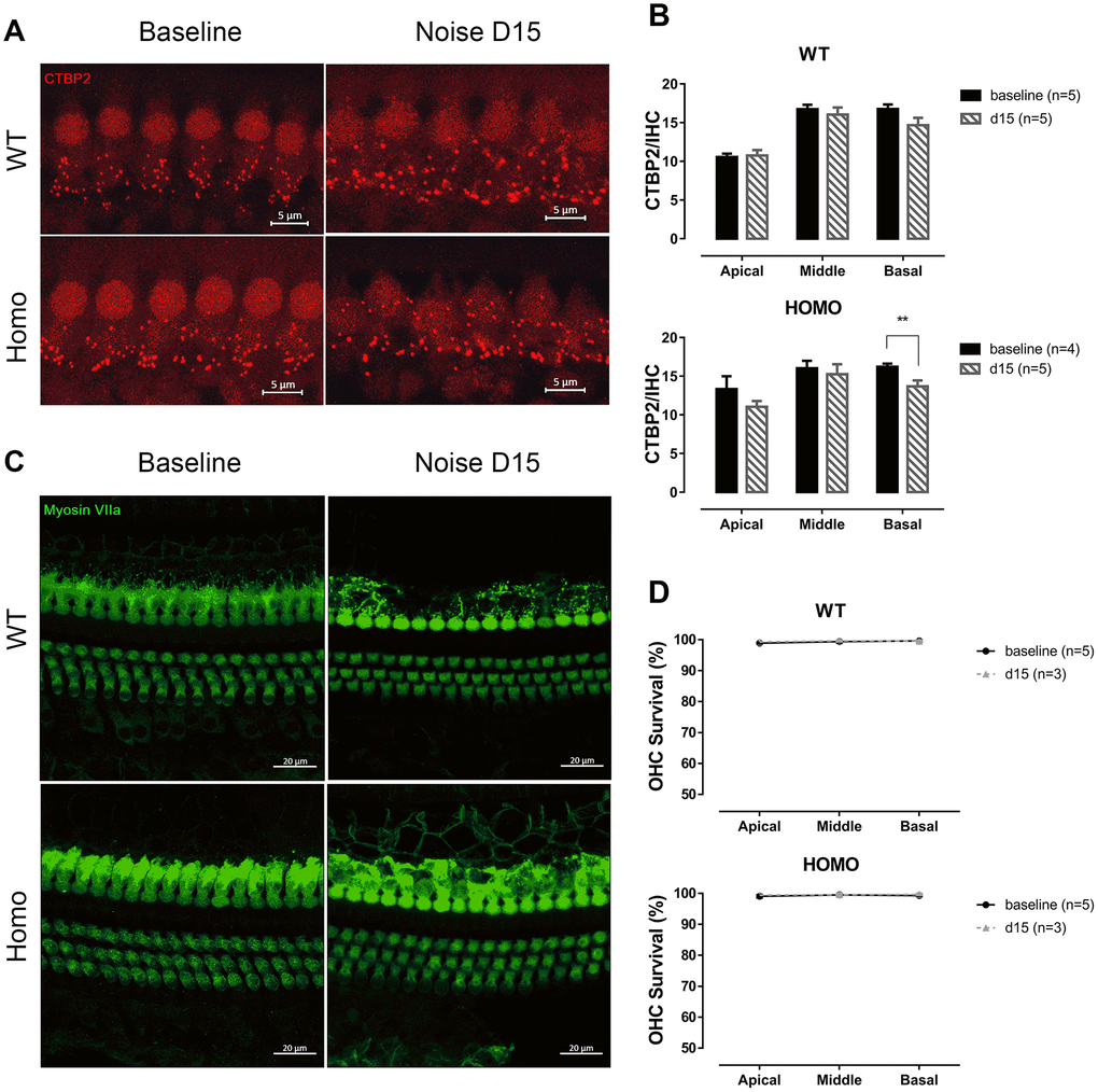 One day after the noise exposure, thresholds of the affected frequencies (above 11.3 kHz) elevated in both homozygous and wild-type mice, but to a higher degree in the homozygous mice. At 15 days after noise exposure, the averaged ABR threshold of homozygous mice were slightly higher than the baseline level but with no significance (especially at 16 kHz with 14.17dB difference and P=0.070), while wild-type mice completely recovered from the temporary threshold shift (Figure 8A, P>0.05 for all frequencies of both genotypes, two-way ANOVA followed by Bonferroni post-test). EP reduction was not essential to the observed susceptibility to noise since the EPs of both genotypes remained stable 15 days after noise exposure (Figure 8B, both P>0.05, Student’s unpaired t-test with Welch’s correction). ABR Wave I analysis at day 15 presented frequency dependent prolonged latencies (Figure 8C, P=0.021, F(1,5)=11.003 at 16 kHz and P=0.016, F(1,5)=12.961 at 22.6 kHz, two-way ANOVA followed by Bonferroni post-test) and normal amplitudes (Figure 8D, P>0.05 for both genotypes, two-way ANOVA followed by Bonferroni post-test) in homozygous mice compared to wild-type controls. CTBP2 puncta, a marker for ribbon synapse in HCs, were significantly reduced at the basal turns in homozygous mice at day 15 (Figure 9A, 9B, P=0.024, F(1,4)=12.423, two-way ANOVA followed by Bonferroni post-test). However, no hair cell loss was observed (Figure 9C, 9D, P>0.05 for both genotypes, two-way ANOVA followed by Bonferroni post-test). These changes in homozygous mice indicate that mutation in Gjb2 rendered cochlea more vulnerable to noise exposure.