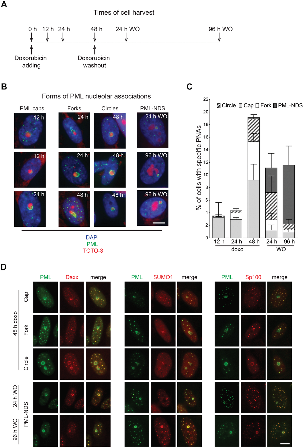 Several classes of compounds including topoisomerase and RNAP I inhibitors can induce the association of PML with nucleolus in human non-cancerous cells ([29–32] and our unpublished data). For the purpose of this study, we selected the topoisomerase II inhibitor doxorubicin used clinically as a chemotherapeutic agent for treatment of several human malignancies as a DNA damaging agent, and the human telomerase-immortalized retinal pigment epithelial cell line RPE-1hTERT as an easily manipulatable non-transformed model. At first, we determined the senescence-inducing dose of doxorubicin (0.75 μM) in RPE-1hTERT as the treatment with the highest ratio of the extent and variability of PNAs to cell death (Supplementary Figure 1A). After two weeks, RPE-1hTERT cells treated with this dose of doxorubicin developed cellular senescence as shown by loss of proliferation, presence of DNA damage detected as γH2A.X foci, characteristic morphological changes, and positivity for senescence-associated β-galactosidase staining (Supplementary Figure 1B–1E). Senescent cells survived at least for four weeks without regaining cell proliferation (data not shown). The formation of diverse PML nucleolar associations was followed by wide field microscopy of formaldehyde-fixed cells harvested at several time points after doxorubicin addition (12, 24 and 48 hours) and after doxorubicin washout (24 and 96 hours; see scheme in Figure 1A). The relative presence of specific forms of PNAs resembling caps, forks, circles and PML-NDS (termed according to their 2-D appearance) clearly changed during the time of doxorubicin treatment and washout (Figure 1B, 1C). The proportion of PML ‘cap-like’ nucleolar structures dominated in the 12-hour sample and coincided with the stress-induced elevation of the PML protein levels (note, unperturbed RPE-1hTERT cells showed a very low level of PML and number of PML NBs). The appearance of PML ‘fork-like’ and ‘circle-like’ nucleolar structures followed the PML caps as could be detected in the 48-hour samples and these structures persisted even after doxorubicin removal. PML-NDS were almost undetected until 48 hours after doxorubicin addition, however, their presence strongly increased after doxorubicin washout and was associated with the decrease of other PNAs forms as can be observed at 96 hours after doxorubicin removal. All forms of PNAs were positive for other constituents of PML NBs such as Sp100, Daxx and SUMO1 (Figure 1D). Note, not all cell nucleoli contained PNAs at the same time and some cells contained nucleoli with different forms of PNAs simultaneously, indicating asynchronous changes in functional states of individual nucleoli (Supplementary Figure 2A, 2B). The formation of PNAs was not restricted to doxorubicin-treated RPE-1hTERT cells, as human mesenchymal stem cells (hMSC) or normal diploid BJ fibroblasts showed similar extents and patterns of PNAs formation (Supplementary Figure 2C).