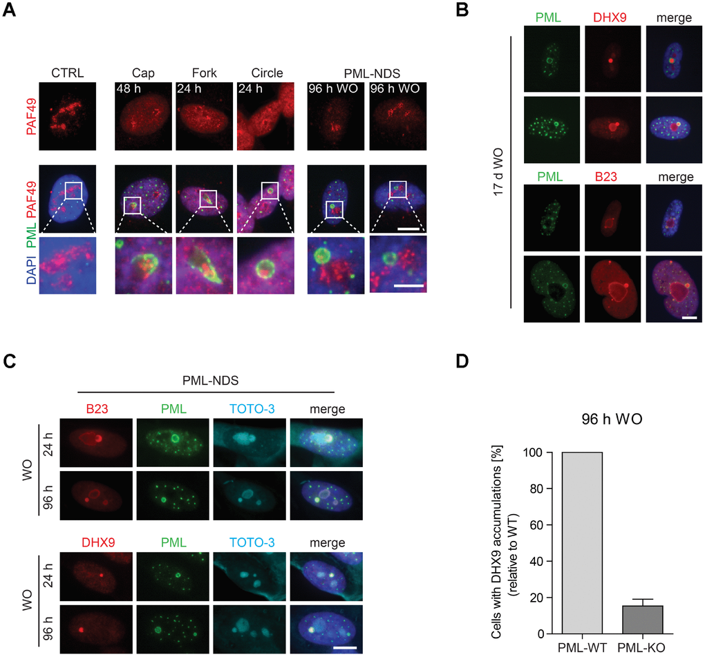 The characteristic feature of the PML-NDS, distinguishing them from the large PML NBs, is an accumulation of nucleophosmin (B23), and DNA helicase II (DHX9) (Figure 2B, 2C; [29]). Sequestration of these proteins into PML-NDS is most likely a selective process, as several other nucleolar proteins, such as fibrillarin, Nopp140, PAF49 and UBF, localized into PML-NDS only partly or not at all (Supplementary Figure 4). To test whether the genesis of these accumulations requires PML, we utilized the RPE-1hTERT cells in which PML had been completely ablated by gene knock-out (PML-KO; [25]). The PML wild-type (PML-WT) and PML-KO cells were stained for DHX9 and subjected to quantitative analysis by Olympus ScanR at 96 hours after doxorubicin washout, i.e. at a time-point when PML-NDS were readily detectable in PML-WT cells. As shown in Figure 2D, a five times higher number of PML-WT cells with DHX9 spots – compared to PML-KO cells – was detected, indicating a functional role of PML in the formation of PML-NDS. It should be emphasized that the DHX9 accumulations identified in PML-KO cells were overall less intense and of irregular shape (Supplementary Figure 5A), suggesting they reflected rather random spots of higher DHX9 signal accumulation, unlikely representing the proper PML-derived DHX9 accumulations. To elucidate whether DHX9 might be primed for degradation in PML-NDS, we measured the total protein level of DHX9 in PML-WT and PML-KO cells at several time-points after doxorubicin addition and found that even though DHX9 was gradually degraded after doxorubicin treatment, the degradation was not dependent on PML, as there was no significant difference in DHX9 level between PML-WT and PML-KO cells (Supplementary Figure 5B).