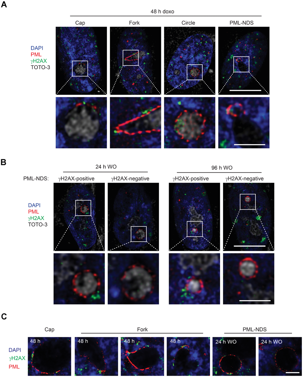 As PML nuclear bodies associate with irreparable DNA damage foci [21–24] characteristic for senescent cells [25, 26] and doxorubicin induces DNA damage and DNA damage response (DDR), we analyzed next whether there is an association of the PNAs with a DNA damage marker, histone H2A.X phosphorylated on serine 139 (γH2AX; [35]). Using confocal fluorescence microscopy, we found that 48 hours after doxorubicin addition all types of PNAs (caps, forks, circles and PML-NDS) associated with γH2AX signal (Figure 6A). Furthermore, to examine whether all the PML-NDS stay in contact with the DNA lesions we compared the cells 48 hours after addition of doxorubicin with those 24 and 96 hours after doxorubicin washout. We found out that all PML-NDS captured before doxorubicin washout (i.e. 48 hours after doxorubicin addition) associated with γH2AX, which was very similar to the sample obtained 24 hours after doxorubicin washout (the γH2AX signal was not detected only in one PML-NDS from 13 captured). However, 96 hours after doxorubicin washout only 60% of analyzed PML-NDS (n = 14) contained detectable γH2AX signal (Figure 6B).