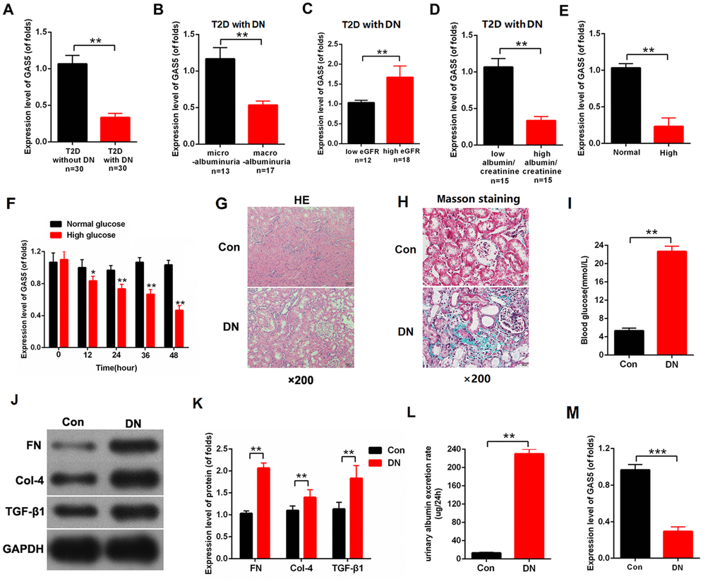 Animal models were handled according to the literature [20]. Male Sprague-Dawley rats (8 weeks, n=8 for every group) were bought from Shanghai Laboratory Animal Center (Shanghai, China). STZ (50 mg/kg) was used to establish DN rat models. STZ was dissolved in 0.1M citrate acid buffer. Then, a DN rate model was established by the intraperitoneal injection of STZ once a day for 5 days. Blood glucose levels of more than 16.5 mmol/L were identified as successful DN rate models. According to the experimental objective, DN rats were divided into two groups: DN + LV-NC and DN + LV-GAS5. For the detection of lncRNA GAS5 overexpression, the lentivirus vector for lncRNA GAS5 was used. LV- GAS5 or LV-NC (200ul) was injected into the DN rat models through the caudal vein. All the DN rate models were killed at the end of the 3rd week. This study was approved by the ethic committee of Tongren Hospital Affiliated to Shanghai Jiaotong University and was based on the Guide for the Care and Use of Laboratory Animals of the NIH.