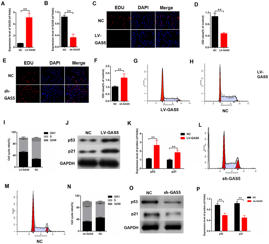 To further investigate the effect of lncRNA GAS5 on cell proliferation, lncRNA GAS5 overexpression or knockdown was carried out. The efficiency of LV-GAS5 and sh-GAS5 was detected by qPCR (Figure 2A, 2B). As indicated in Figure 2C, 2D, the upregulation of lncRNA GAS5 inhibited proliferation in MCs, whereas the downregulation of lncRNA GAS5 enhanced proliferation (Figure 2E, 2F). Flow cytometry analysis was performed, and the results revealed that MCs was arrested in the G0/1phase after they were transfected with LV-GAS5 (Figure 2F–2I). The Western blot results revealed that lncRNA GAS5 overexpression increased the expression level of p53 and p21 (Figure 2J, 2K). Overall, our findings demonstrated that lncRNA GAS5 inhibits cell proliferation in MCs and increases p53 and p21 expression.