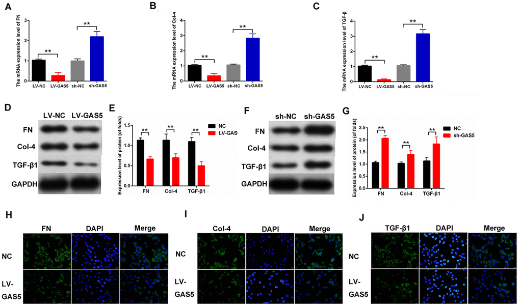 Total RNA was extracted by using TRIzol Reagent (Invitrogen, US). The expression levels of the mRNAs were assessed by using an SYBR Premix ExTaqTM II (Takara, China). FN, TGFβ1, TNF-α, and GAPDH expression levels were detected by using the following specific primers: F-5′-CGGTGGCTGTCAGTCAAAG-3′ and R-5′-AAACCTCGGCTTCCTCCATAA-3′; F-5′-GGCCAGATCCTGTCCAAGC-3′ and R-5′-GTGGGTT TCCACCATTAGCAC-3′; F-5′-CCTCTCTCTAATCAG CCCTCTG-3′ and R-5′-GAGGACCTGGGAGTAGATG AG-3′; F-5′-GGAGCGAGATCCCTCCAAAAT-3′ and R-5′-GGCTGTTGTCATACTTCTCATGG-3′. The two primers of GAS5 were as follows: forward, 5′-CGCG GATCCGTGCTGGGTGCAGATGCAGTGTGgc-3′ and reverse, 5′-CCGCTCGAGTTTTTTTTTTTTTTTTTTTT TTT-3′.