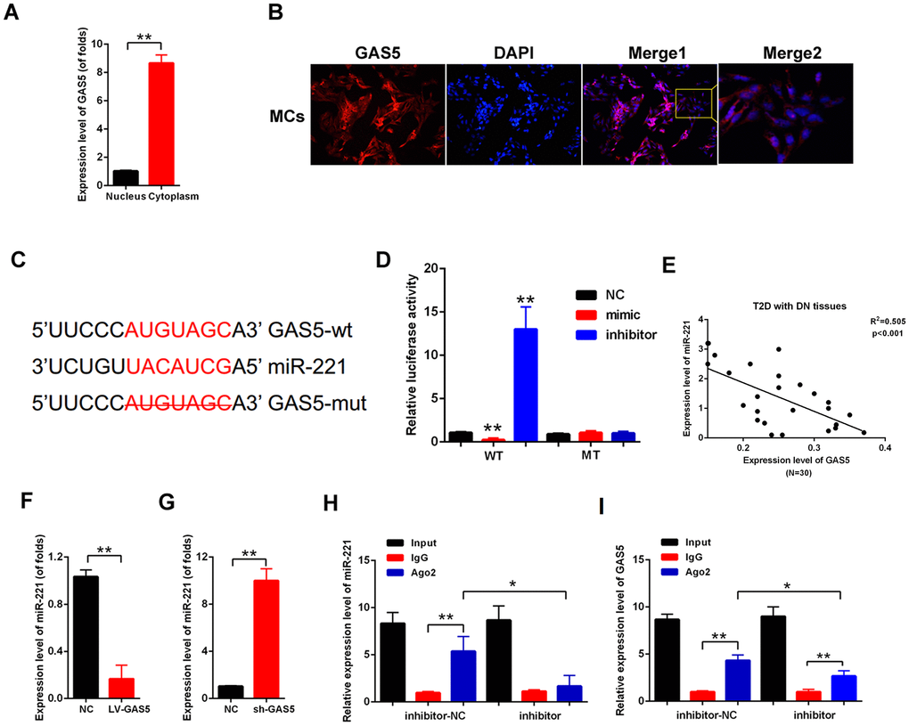 Competing endogenous RNAs (ceRNAs) have become vital regulatory mechanisms for lncRNAs [19]. First, acting as an effective miRNA sponge, lncRNA should be mainly expressed in the cytoplasm. Nuclear and cytoplasmic RNA extraction was performed. The qPCR results showed that lncRNA GAS5 was expressed higher in cytoplasm than in the nucleus (Figure 4A). Moreover, FISH images showed that lncRNA GAS5 was mainly located in the cytoplasm of the MCs (Figure 4B). The potential target miRNAs of lncRNA GAS5 were predicted by LncBase (https://diana.e-ce.uth.gr/lncbasev3). MiR-221 was predicted as a candidate of lncRNA GAS5. The direct binding between lncRNA GAS5 and miR-221 is shown in Figure 4C. Luciferase reporter assay was carried out to confirm the direct binding relationship between lncRNA GAS5 and miR-221. The results showed that lncRNA GAS5 wild-type reporter gene was decreased in luciferase activity by miR-221. However, the mutant-type reporter gene was not inhibited in luciferase activity by miR-221 (Figure 4D). Moreover, the relationship between lncRNA GAS5 and miR-221 was detected in T2D with DN tissues (N=30). Result showed that there is negative correlation between lncRNA GAS5 and miR-221 (Figure 4E). Then, qPCR results showed that lncRNA GAS5 overexpression decreased miR-221 expression, whereas lncRNA knockout increased miR-221 expression in the MCs (Figure 4F, 4G). miRNAs serve as part of RNA-induced silencing complex (RISC), and lncRNA regulates gene expression though an RISC [15]. We carried out RIP analysis to investigate whether lncRNA GAS5 and miR-221 are in an RISC. As indicated in Figure 4H, 4I, the expression levels of lncRNA GAS5 and miR-221 increased in the anti-Ago2 group compared with those of the control group. In the anti-miR-221 group, the expression levels of lncRNA GAS5 and miR-221 immunoprecipitated with Ago2 decreased compared with those of the anti-normal IgG group. These results revealed that lncRNA GAS5 decrease miR-221 expression in the manner of directly targeting and Ago2-dependent manner.