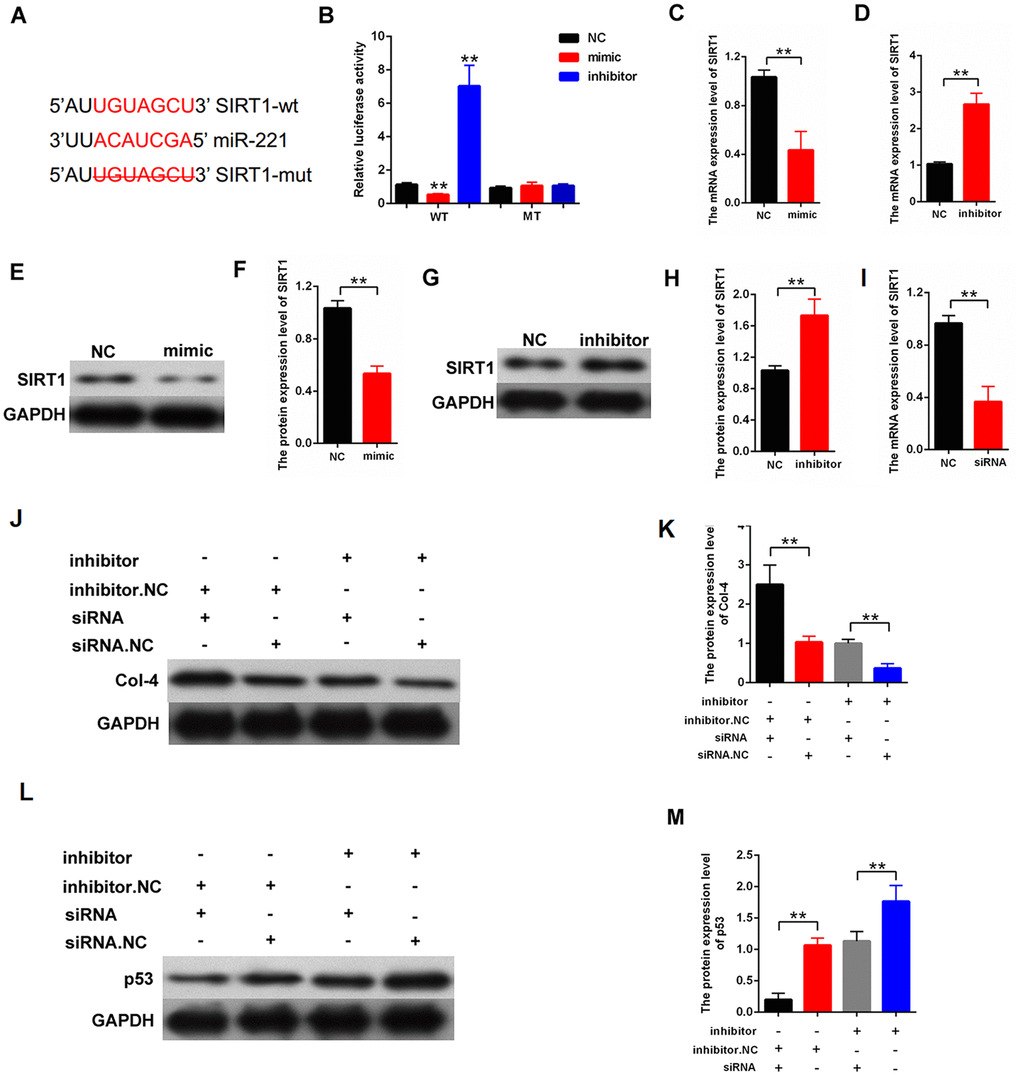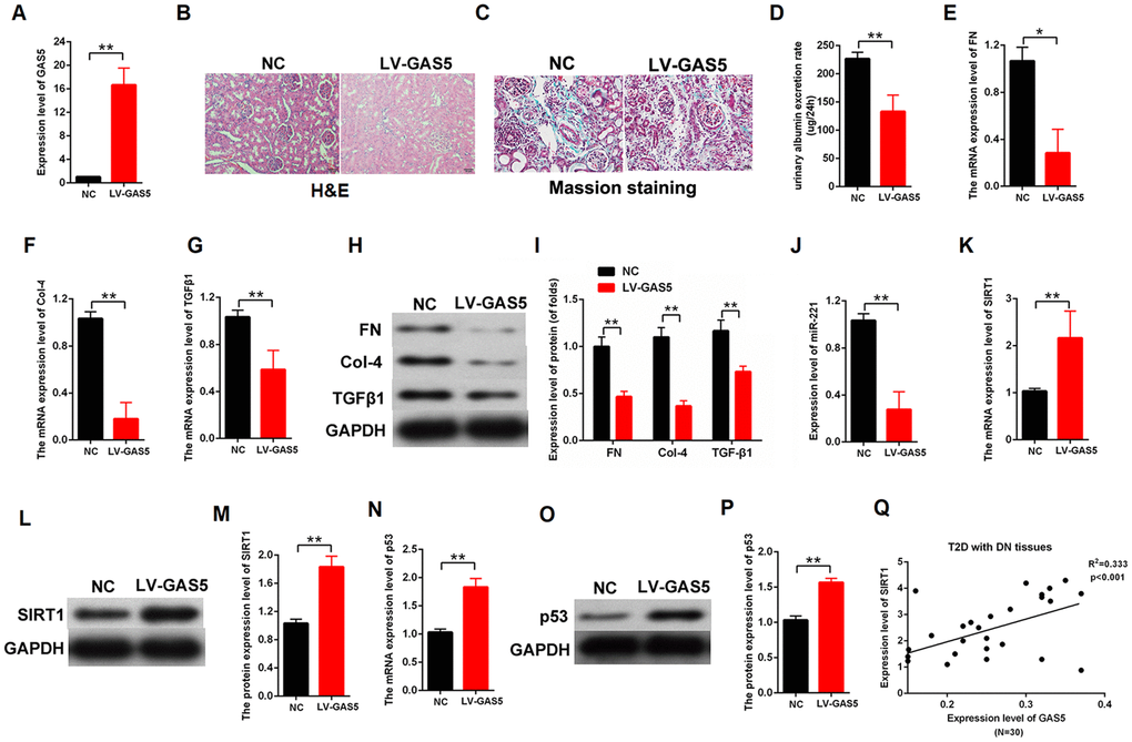 We established DN rat models to confirm the lncRNA GAS5 effect in vivo. The LV-GAS5 group (N=8) and LV-NC group (N=8) were established by injection with LV-GAS5 and LV-NC, respectively. The qPCR results showed that LV-GAS5 overexpression in the DN rat models was successfully established (Figure 8A). The H&E stains of the DN results were observed with a microscope (Figure 8B). Moreover, Masson staining revealed that there were less deposits of collagen (blue color) in the DN model transfected with LV-GAS5 compared with negative control (Figure 8C). We found that lncRNA GAS5 overexpression alleviated urinary albumin excretion rate in the DN rat models (Figure 8D). Total proteins were extracted from the both groups. The qPCR results showed that lncRNA GAS5 overexpression decreased the mRNA expression levels of fibrosis markers FN, Col-4, and TGFβ1 (Figure 8E–8G). Moreover, lncRNA GAS5 overexpression reduced the protein levels of FN, Col-4, and TGFβ1 in vivo (Figure 8H, 8I). To confirm the relationship between lncRNA GAS5 and miR-221 or SIRT1, the qPCR and western blot was performed in the DN tissues. Our finding indicated that lncRNA GAS5 overexpression downregulated the miR-221 expression and upregulated SIRT1 expression (Figure 8J–8M). Finally, the mRNA and protein expression level of p53 was detected in the DN tissues. Results indicated that lncRNA GAS5 overexpression increased the expression level of p53 (Figure 8N–8P). These data indicated that lncRNA GAS5 overexpression regulated miR-221 and SIRT1 expression and alleviated DN progression in vivo. Additionally, the expression levels of lncRNA GAS5 and SIRT1 were detected in T2D with DN tissues (N=30). Result revealed that there is positively correlation between lncRNA GAS5 and SIRT1 (Figure 8Q).