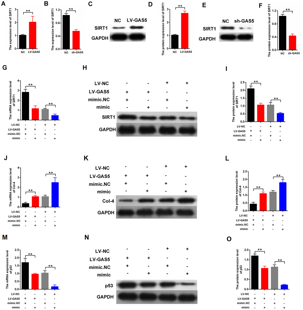 TRIzol Reagent (Life USA) was utilized in RNA isolation. RNA samples with Abs260nm/Abs280nm ratio of >1.8 were used. Lentivirus vector for lncRNA GSA5 was built by Shanghai Genechem Co (China). miRNA-mimic/miRNA-inhibitor and corresponding controls were bought from RiboBio (China). The sequence of SIRT1 was subcloned into the plasmid vector (pcDNA3.1). The empty vector acted as negative control. The SIRT1 siRNA sequences were sense 5′-CCCUGUAAAGCUUUCAGAAdtdt-3′ and antisense 5′-UUCUGAAAGCUUUACAGGGdtdt-3′ (Genepharma, Shanghai, China). Lipofectamine 2000 (Life USA) was used for transfection in accordance with the manufacturer’s instructions.