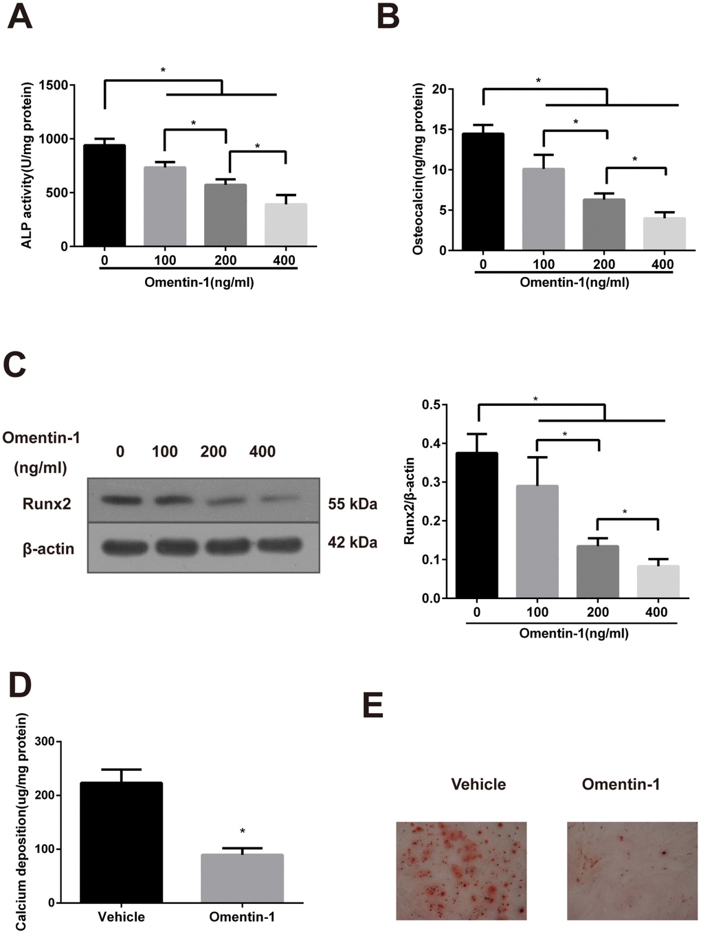In this study, the activity of ALP, the secretion of OC and the expression of Runx2 were measured to identify the function of omentin-1 on phenotype transition of VSMCs. Calcium deposition detection and Alizarin Red S staining were performed to evaluate the mineralisation level of VSMCs.