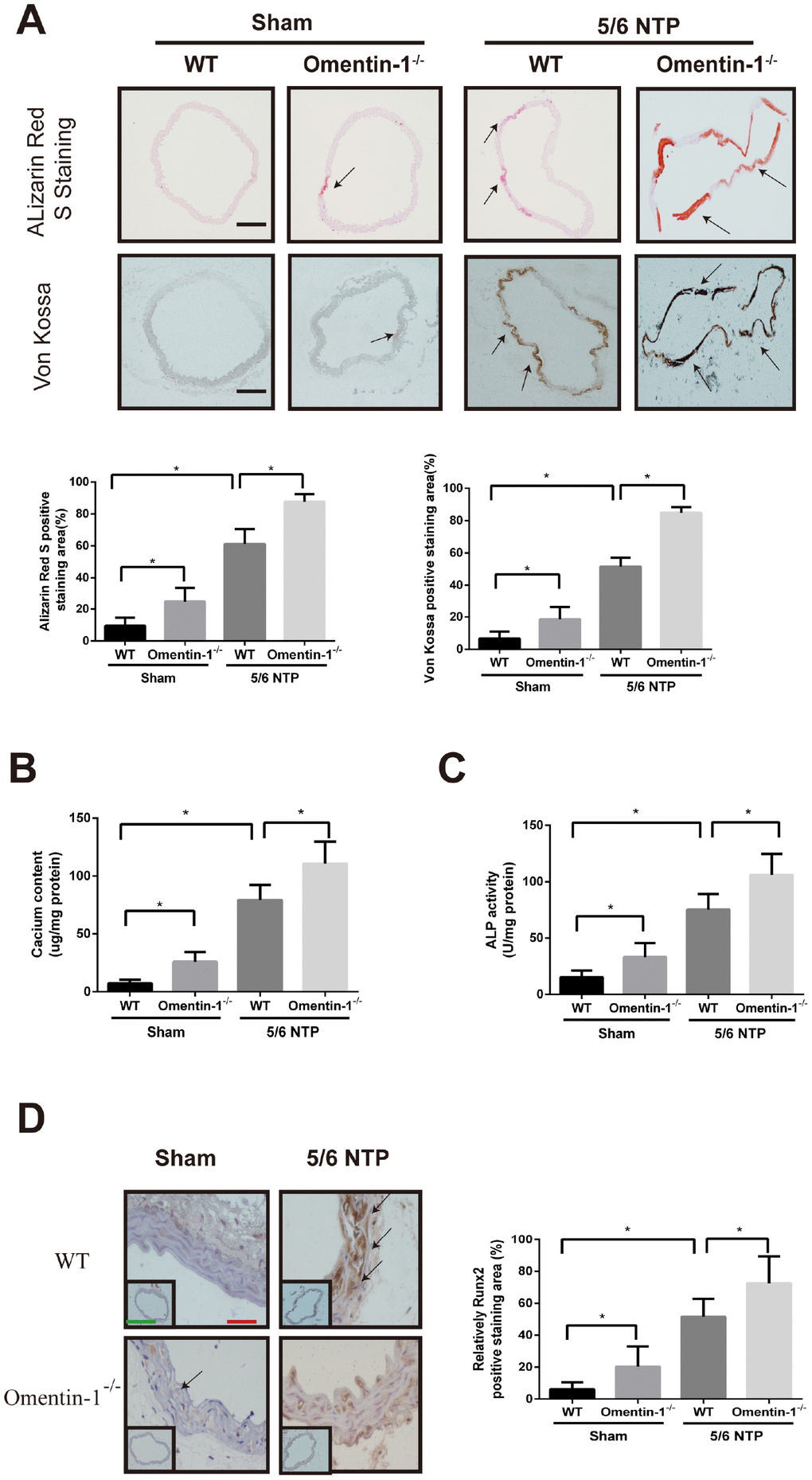 To investigate whether omentin-1 plays a role in the process of endogenous arterial calcification progression, we constructed global omentin-1 null mice and analyzed calcification level by using 5/6-nephrectomy (5/6 NTP) induced mice as in vivo calcification model. Briefly, omentin-1-/- mice and their wild-type littermates (WT) were subjected to 5/6 nephrectomy or sham operation following by high phosphate diet treatment and the level of arterial calcification was detected. Deletion of omentin-1 was confirmed by the absence of protein expression in adipose tissue and undetectable level in plasma of omentin-1-/- mice (Supplementary Figure 2A, 2B). Meanwhile, circulating plasma omentin-1 level was decreased in 5/6 NTP mice when compared with control mice (Supplementary Figure 2B). No obvious Von Kossa and Alizarin Red S staining was found in WT mice after sham operation (Figure 2A). Intriguingly, the arterial calcification level of sham control omentin-1-/- mice ranged from undetectable to just slight. In contrast, significant artery calcification was observed in NTP-induced mice and more obvious staining was found in omentin-1-/- mice compared with their wild-type littermates (Figure 2A). Moreover, our results demonstrated that aortic calcium content, ALP activities and Runx2 immunostaining were increased in NTP-induced omentin-1-/- mice when compared with their wild-type littermates and sham control omentin-1-/- mice (Figure 2B–2D). These results show that the omentin-1 serves as a protective factor in NTP-induced calcification in mice.