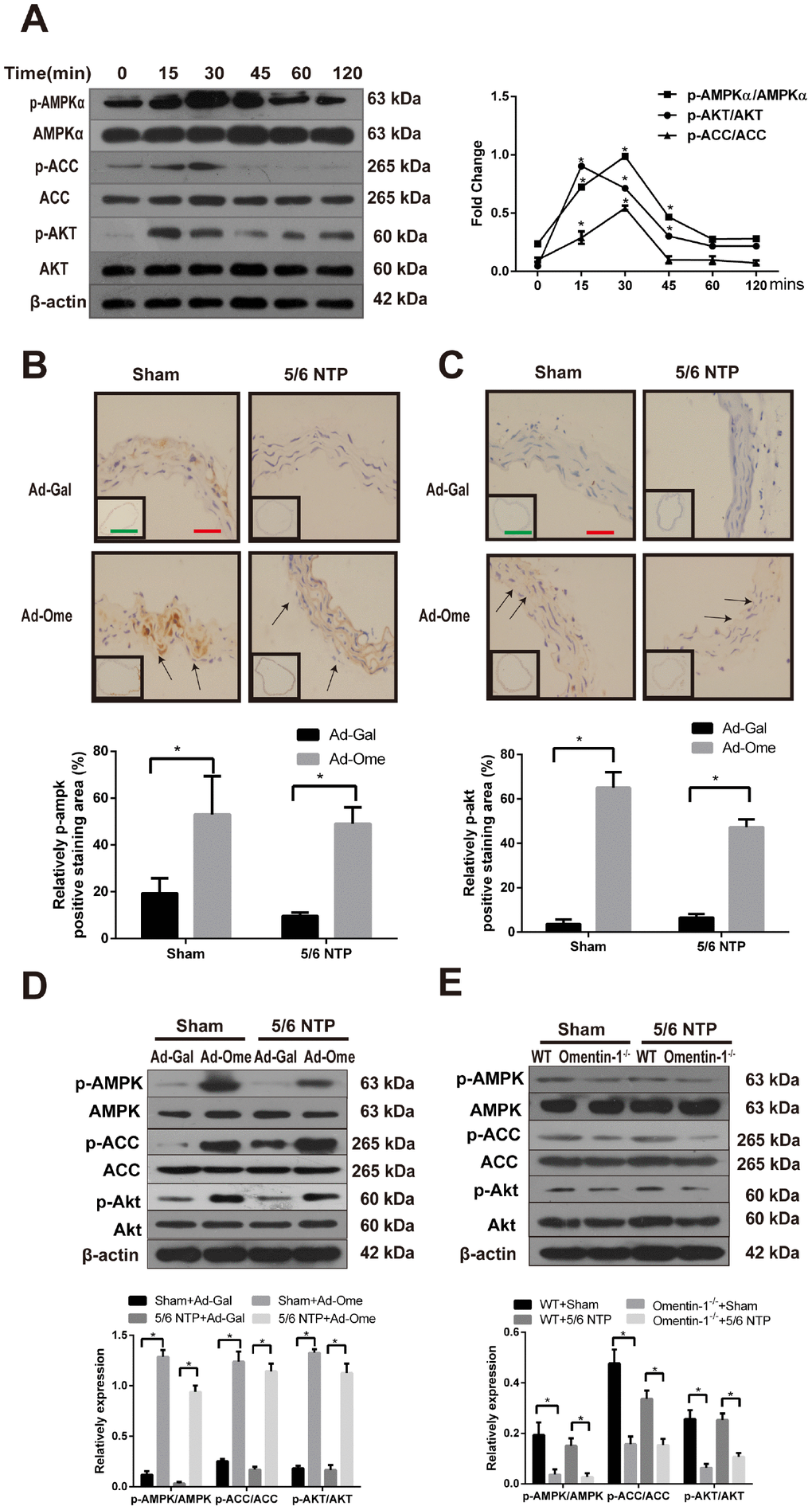The AMPK is known as a sensor of cellular energy and nutrient status and recent studies have demonstrated that AMPK is involved in osteoblastic differentiation [21, 27]. Previous work also shown that Akt signaling pathway was activated after treatment of omentin [24]. In this study, we further investigate the role of AMPK in omentin-1 induced inhibition effects on osteogenic conversion of VSMCs and the crosstalk between AMPK and Akt in this process. CVSMCs were treated with omentin-1 (400ng/ml) and the phosphorylation level of AMPKα, acetyl-CoA carboxylase (ACC) and Akt were examined by western blot. Phosphorylation of AMPK was firstly observed at 15 minutes and reached the highest point at 30 minutes after induction of omentin-1 in CVSMCs, while no significant change was observed in total AMPK level in the same period (Figure 3A). Moreover, phosphorylation of ACC, one of the most important downstream targets of AMPK, was also induced by omentin-1 treatment (Figure 3A). Meanwhile, we found marked activation of Akt after omentin-1 treatment for 15 min. Next, we detected phosphorylation of AMPK and Akt level in NTP-induced mice after tail vein injection of Ad-Ome. Similarly, we found that overexpression of omentin-1 significantly increased the immunostaining level of AMPK, Akt in the mouse aorta (Figure 3B, 3C). Intriguingly, western blot analysis showed that overexpression of omentin-1 also stimulated AMPK, ACC and Akt phosphorylation in mice (Figure 3D). However, deficient of omentin-1 resulted in decreased AMPK, ACC and Akt phosphorylation level in the aorta of both sham and 5/6NTP operation mice when compared with that of WT mice (Figure 3E). Taken together, these results suggest that AMPK and Akt signaling pathway may play a key role in omentin-1-induced inhibition of VSMC calcification and artery calcification.