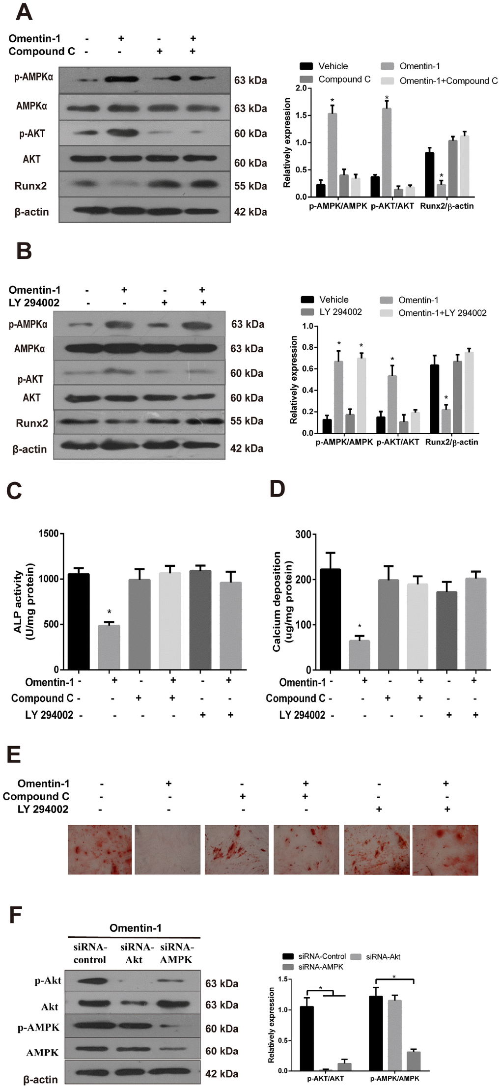 To further confirm the involvement of AMPK and Akt activation in omentin-1 induced inhibition of VSMC calcification, CVSMCs were treated with or without omentin-1 (400 ng/ml), or Compound C (10 μM), an inhibitor of AMPK, or LY 294002, an inhibitor of Akt. In the presence of Compound C, omentin-1 induced inhibition effects on the Runx2 protein expression (Figure 4A), the ALP activity (Figure 4C), calcium deposition (Figure 4D) and Alizarin Red S staining level (Figure 4E) were abolished. Similarly, we also found that inhibition of Akt mimicked the effects of Compound C (Figure 4B–4E). Interestingly, inhibition of Akt had no effect on the omentin-1 induced phosphorylation of AMPK (Figure 4B), while inhibition of AMPK significantly abolished omentin-1 induced phosphorylation of Akt (Figure 4A). To further examine the relationship between PI3K and AMPK, we knocked down AMPK and Akt by specific siRNA and then observed changes in p-AMPK and p-Akt. The results showed that AMPK knockdown blocked omentin-1 induced AMPK and Akt phosphorylation, while Akt knockdown only blocked omentin-1 induced Akt activation but not AMPK activation (Figure 4F), indicating that Akt is downstream of AMPK in omentin-1 induced signaling activation. Thus, these experiments demonstrate that omentin-1 inhibits osteoblastic differentiation and mineralisation of VSMCs dependent on AMPK/Akt signaling pathway.