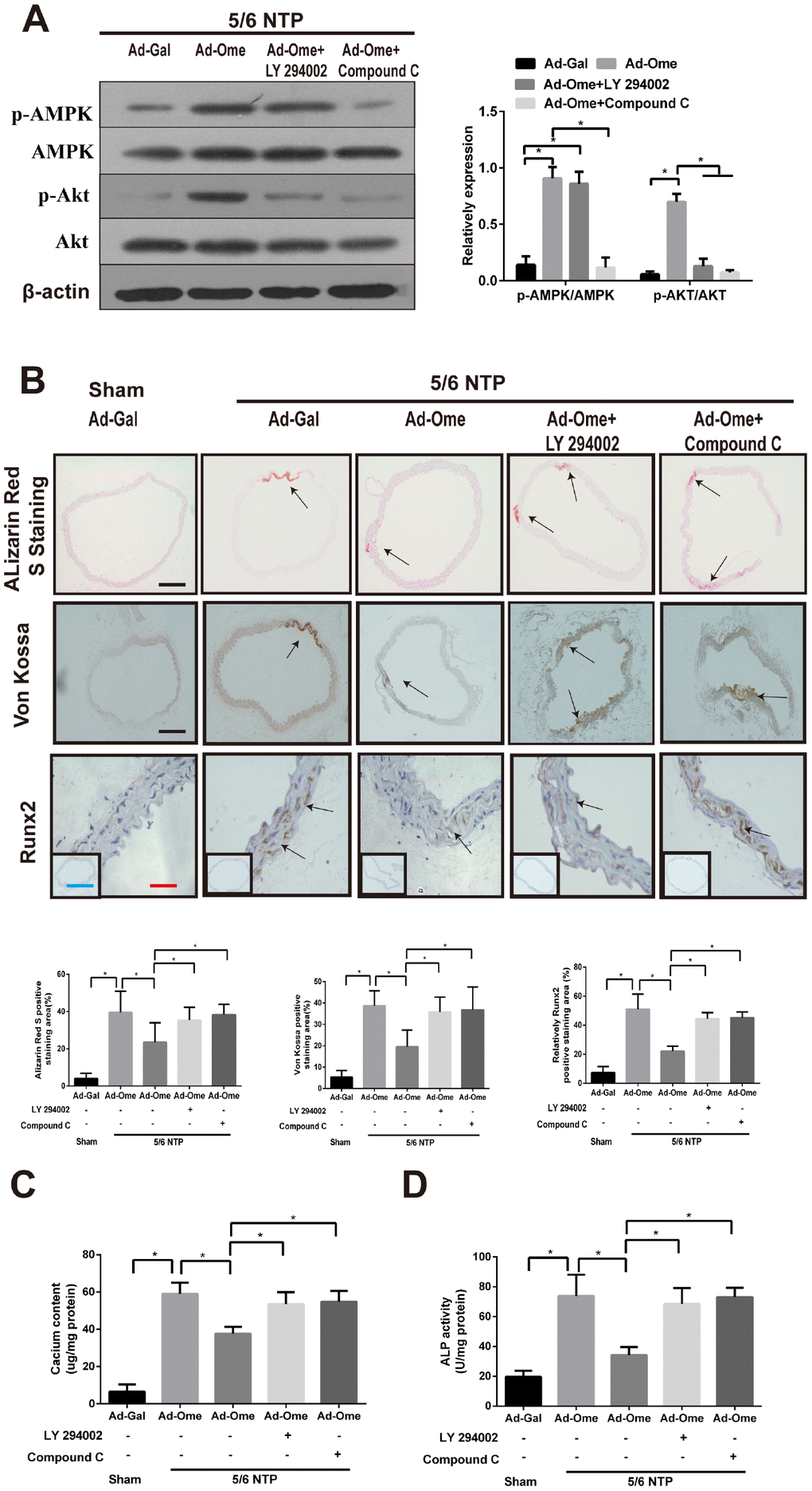 To elucidate the effect of omentin-1 on vascular calcification in vivo, we performed 5/6 nephrectomy in C57BL/6 mice with sham operation as control mice. All these mice were raised with high–phosphate diet for twelve weeks following by tail vein injection of Ad-Ome or Ad-Gal as a negative control for four weeks. Alizarin Red S staining and Von Kossa staining were used to determine artery calcification in the thoracic aorta tissue. Calcium content and the ALP activity of the thoracic aorta tissue were also determined. Moreover, the thoracic aorta Runx2 expression was tested by immunochemistry. Phosphorylation of AMPK and Akt in the aorta after treatment of PI3K inhibitor or Compound were confirmed by western blot. Increased circulating human omentin-1 after four times of Ad-Ome administration were confirmed as shown in Supplementary Table 1. The results shown that treatment of PI3K inhibitor LY294002 blocked Ad-Ome-induced Akt phosphorylation but not AMPK phosphorylation in the aorta of 5/6 NTP mice, while AMPK inhibitor Compound C blocked both Akt and AMPK phosphorylation induced by Ad-Ome (Figure 5A). 5/6 NTP plus high-phosphate diet significantly increased Alizarin Red S staining level, Von Kossa staining level (Figure 5B), calcium content (Figure 5C) and the ALP activity (Figure 5D) in the thoracic tissues compared with those of sham control group. In consistent, Runx2 expression was increased in 5/6 NTP mice compared with sham control mice, further demonstrating that 5/6 NTP mice successfully developed artery calcification (Figure 5B). However, overexpression of omentin-1 partially alleviated 5/6 NTP-induced arterial calcification compared with Ad-Gal control group, as demonstrated by reduced immunostaining of Von Kossa, Alizarin Red S, Runx2 (Figure 5B), decreased level of calcium content and the ALP activity (Figure 5C, 5D) in the thoracic aorta tissues. Furthermore, Pretreatment with either Akt or AMPK inhibitors abolished omentin-1 induced anti-calcification effects (Figure 5B–5D). These results strongly suggest that omentin-1 acts through activation of AMPK/Akt signaling pathway to exert anti-calcification effects in 5/6 NTP induced mice.