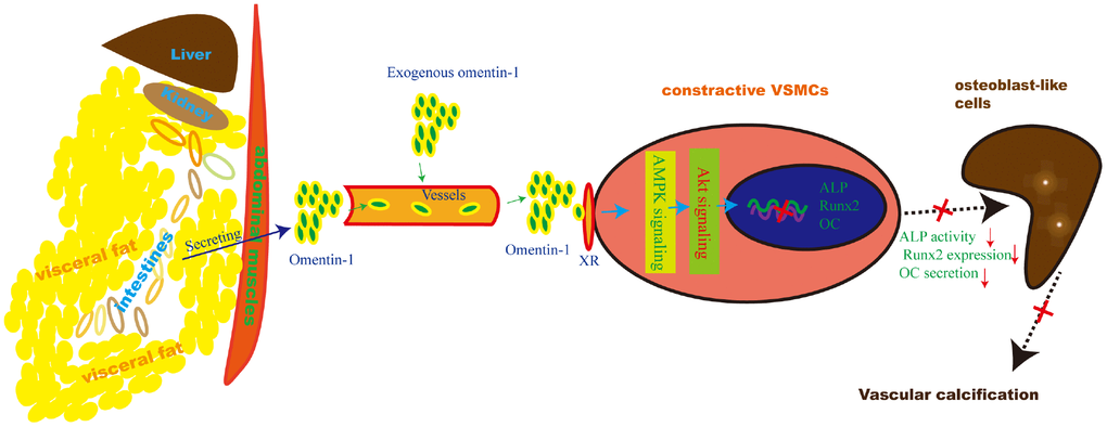 Herein, we provide reliable evidence that omentin-1 mediates adipose-cardiovascular system interaction. Supplementation of exogenous human omentin-1 reduced VSMCs calcification in vitro and alleviated 5/6 NTP-induced arterial calcification in vivo while deletion of endogenous omentin-1 accelerated arterial calcification in 5/6 NTP-induced mice. Moreover, Inhibition of both AMPK and Akt abolished omentin-1 induced anti-calcification effects in calcifying VSMCs and 5/6 NTP-induced arterial calcification in mice. These data suggest that adipose-derived omentin-1 activates AMPK/Akt signaling in the aorta VSMCs and then inhibits osteoblastic differentiation of VSMCs, resulting in reduced arterial calcification (Figure 6). These findings also open up new windows to explore the role of omentin-1 in mediating adipose tissue and other organs or systems interaction.