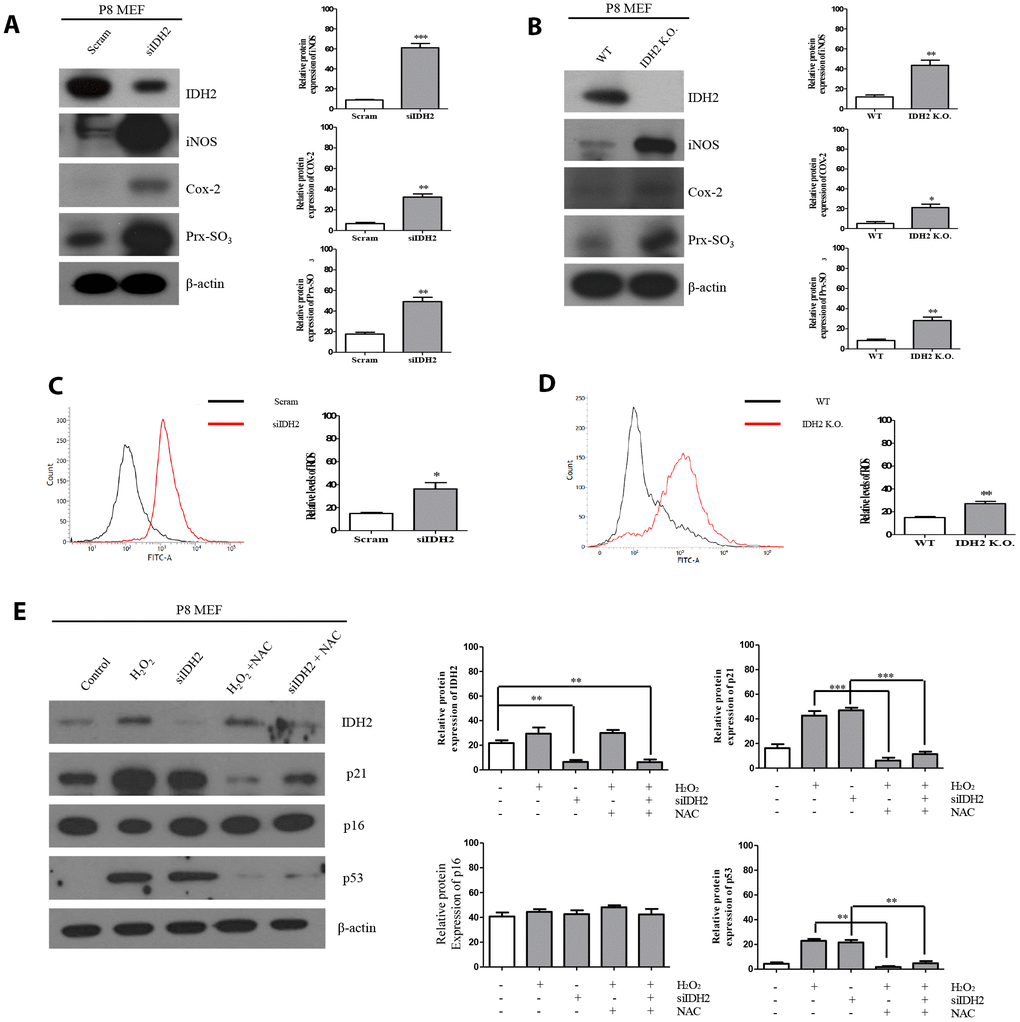 Previous studies demonstrated that excessive ROS production accelerates the aging process and IDH2 deficiency elevates ROS generation. However, there have been no studies on the relationship between IDH2 deficiency-induced ROS generation and aging. Our studies suggest that Idh2 deficiency accelerates aging through the p21 signaling pathway. Therefore, we used siRNA and Idh2 knockout MEFs to downregulate Idh2 expression. Before these experiments, we evaluated off-target effects for the Idh2 siRNA sequence by testing another predesigned siRNA (Supplementary Figure 2). All siRNAs show similar expression patterns of p21, p53, and p16 in MEFs. Idh2 knockdown in MEFs results in increased levels of pro-inflammatory mediators, iNOS and Cox-2, and a well-known ROS marker protein, Prx-SO3 (Figure 5A). Idh2 knockout MEFs also show increased levels of iNOS and Cox-2 and Prx-SO3 (Figure 5B). Furthermore, increased levels of total ROS are seen in Idh2-knockdown and Idh2 knockout MEFs using flow cytometry (Figure 5C and 5D, respectively). Next, we used H2O2 to detect changes in ROS levels in P8 MEFs (Figure 5E). H2O2 is a well-known ROS-generating material that induces premature senescence. H2O2 treatment increases levels of senescence marker proteins p21 and p53. Furthermore, an ROS scavenger, N-acetyl cysteine (NAC), prevents the upregulation of senescence and ROS marker proteins. Idh2 knockdown also results in a similar pattern as H2O2 treatment in MEFs. NAC treatment also prevents Idh2 knockdown-induced upregulation of senescence marker proteins. We conclude that Idh2 downregulation induced ROS generation, which promoted an increase in p21 expression.
