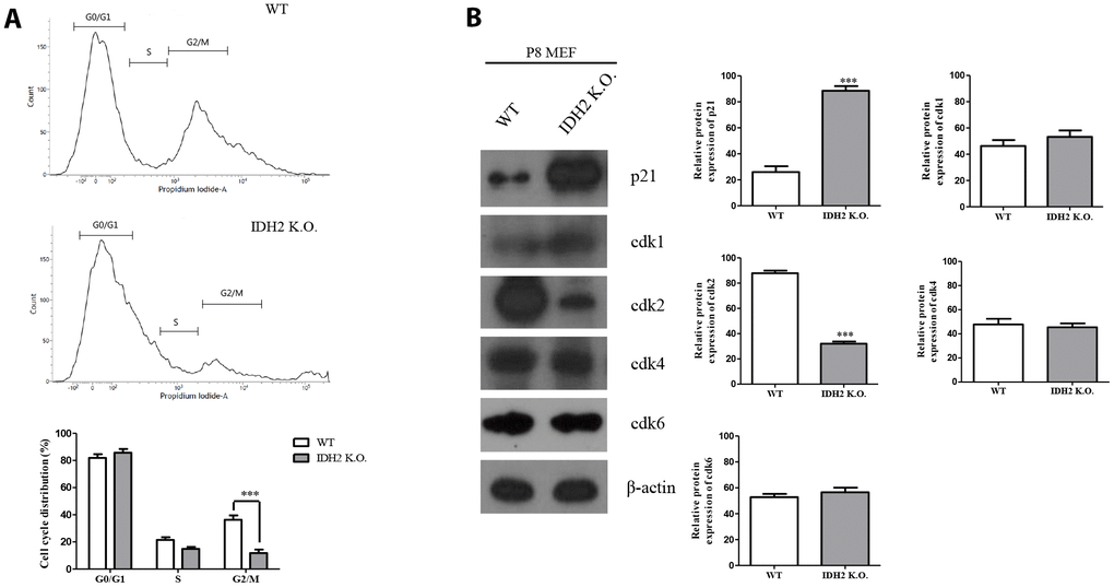Generally, the induction of senescence is associated with cell cycle regulation. Cyclin-dependent kinase proteins participate in regulating the cell cycle, including Cdk1, Cdk2, Cdk4, and Cdk6. Multiple studies have suggested that dysfunction of cyclin-dependent kinase proteins induces cell cycle arrest, which can promote cellular senescence [18]. Therefore, we examined cell cycle arrest and dysfunction of cyclin-dependent kinase proteins in Idh2 knockout mice by propidium iodide staining to evaluate cell cycle by flow cytometry. Compared with wild type MEFs, Idh2-knockout MEFs show a low percentage of cell cycle distribution in G0 and G1 phases (Figure 6A). Furthermore, cyclin-dependent kinase protein expression levels show that only Cdk2 is decreased in Idh2 knockout MEFs (Figure 6B). In addition, we measured the Cdk2 mRNA level in Idh2 knockout P8 MEFs (Supplementary Figure 3). In contrast with the protein level, Cdk2 mRNA levels are unaffected by Idh2 knockout. Therefore, Idh2 knockout induces cell cycle arrest through inhibiting Cdk2 at the protein level.