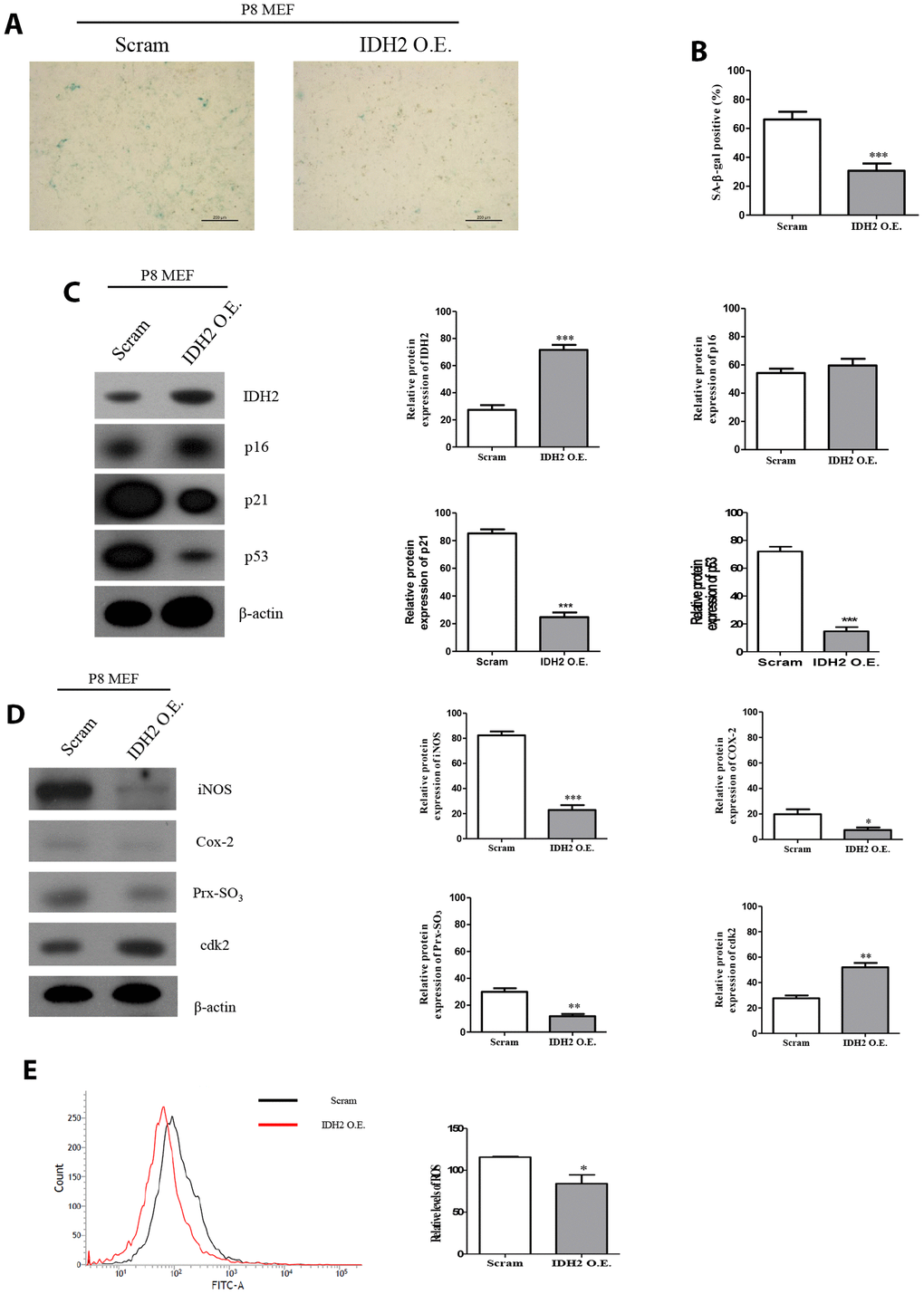 Our results suggested that downregulation of Idh2 accelerates the development of senescence through the p21 signaling pathway. We next examined whether overexpression of Idh2 could protect against senescence. Idh2-overexpressing P8 MEFs show fewer SA-β-gal-positive cells than normal P8 MEFs (Figure 7A and 7B). Furthermore, the increased p21 and p53 levels seen in P8 MEFs are downregulated by overexpressing Idh2 (Figure 7C). Senescence-related ROS generation was also inhibited in Idh2-overexpressing P8 MEFs. The increased levels of iNOS, COX-2, and Prx-SO3 seen in P8 MEFs were diminished by Idh2 overexpression. Furthermore, Cdk2 levels were higher in P8 MEFs that overexpress Idh2 than in control P8 MEFs (Figure 7D). Cellular ROS levels were also decreased in Idh2-overexpressing P8 MEFs (Figure 7E). We conclude that upregulation of Idh2 expression can decelerate cellular senescence.