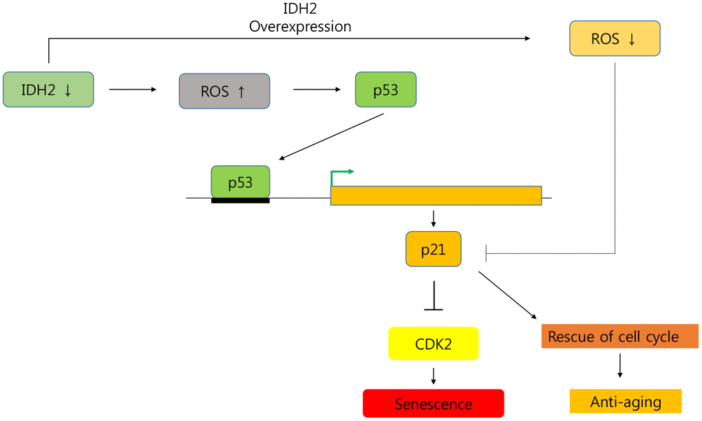 In conclusion, we demonstrated that Idh2 expression decreased cellular senescence, and downregulation of Idh2 promoted it. Furthermore, Idh2 deficiency-induced cell cycle arrest by inhibiting Cdk2 through the p53 and p21 signaling pathways (Figure 8). Interestingly, overexpression of Idh2 alleviated senescence-associated phenotypes as shown by decreased SA-β-gal staining and expression of p21 and p53. Furthermore, Idh2 overexpression increased levels of pro-inflammatory mediators and ROS. Further studies are needed to investigate which factors decrease Idh2 levels in age-dependent conditions. In addition, the anti-senescence effect of Idh2 should also be studied further. Although anti-aging studies have long been a popular focus for many studies, as life expectancy increases, aging studies are receiving more attention. As mentioned above, although more studies are needed, IDH2 represents a fascinating target of future cellular senescence studies.