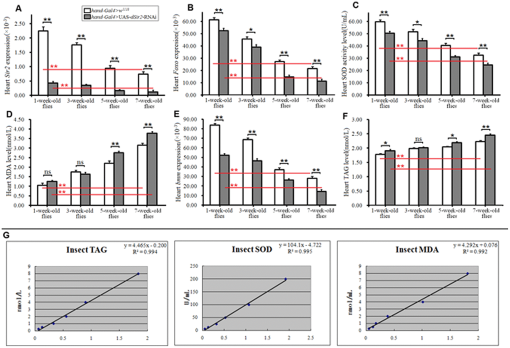 About 80 hearts from each group were homogenized in Trizol. First, 10 μg of the total RNA was purified by organic solvent extraction from the Trizol (TRIzol, Invitrogen). The purified RNA was treated with DNase I (RNase-free, Roche) and used to produce oligo dT-primed cDNAs (SuperScript II RT, Invitrogen), which were then used as templates for quantitative real-time PCR. The rp49 gene was used as an internal reference for normalizing the quantity of total RNAs. Real-time PCR was performed with SYBR green using an ABI7300 Real-time PCR Instrument (Applied Biosystems). Expression of the various genes was determined by the comparative CT method (ABI Prism 7700 Sequence Detection System User Bulletin #2, Applied Biosystems). Primer sequences of Sir2 were as follows: F: 5′-GCAGT GCCAGCCC AATAA-3′; R: 5′-AGCCGATCACGATC AGTAGA-3′. Primer sequences of bmm were as follows: F: F: 5′-ACTGCAC ATTTCGCTTACCC-3′; R: 5′-GAG AATCCGGGTATGAAGCA-3′. Primer sequences of Foxo were as follows: F: 5′-AACAACAGCAGCATC AGCAG-3′; R: 5′-CTGAACCCGAGCATTCAGAT-3′. Primer sequences of dnaJ-H were as follows: F: 5′-GCAAGATGGCACACGTAGCTG-3′; R: 5′-CCACTG TAGCAACACGTAATCACC-3′. Primer sequences of Rp49 were as follows: F: 5 -CTAAGCTG TCGCACAA ATGG-3′; R: 5′-AACTTCTTGAATCCGGTG GG-3′.
