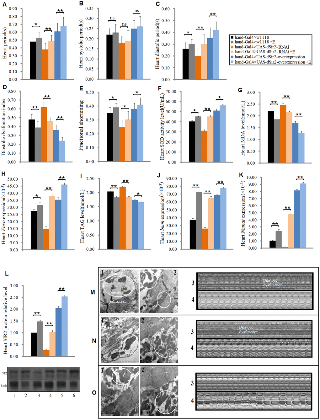 To further confirm whether cardiac dSir2 RNAi could induce age-related changes in the heart, the other cardiac dSir2 RNAi line was built by P{KK109370}VIE-260B and hand-Gla4 in 1-week-old flies. The results showed that the cardiac dSir2 expression of hand-Gal4>UAS-dSir2RNAi flies was significantly lower than that of hand-Gal4>w1118 flies (P<0.01) (a difference of about 5.6-fold; Figure 3A). This suggested that cardiac dSir2 knockdown was also successfully built by the UAS/hand-Gal4 system. Moreover, the results showed that cardiac dSir2 knockdown significantly reduced the SOD activity level and Foxo expression (P<0.01; Figure 3B and 3C), and notably increased MDA levels in young hearts (P<0.01; Figure 3D). In addition, cardiac dSir2 knockdown significantly increased cardiac TAG level (+19.1%) and reduced cardiac bmm expression (P<0.01; Figure 3E and 3F). Finally, cardiac dSir2 knockdown significantly reduced heart period, diastolic period, systolic period, and fractional shortening (P<0.05 or P<0.01; Figure 3G–3I, and 3K), and notably increased the diastolic dysfunction index and systolic diameter (P<0.01; Figure 3J, 3M and 3N). These results suggested that cardiac dSir2 knockdown could increase the incidence of oxidative damage, fat accumulation, and diastolic dysfunction in young hearts, which is similar to the phenotypes associated with aging hearts.