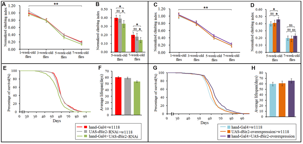 Effect of physical exercise and cardiac dSir2 differential expression on mobility and lifespan in Drosophila