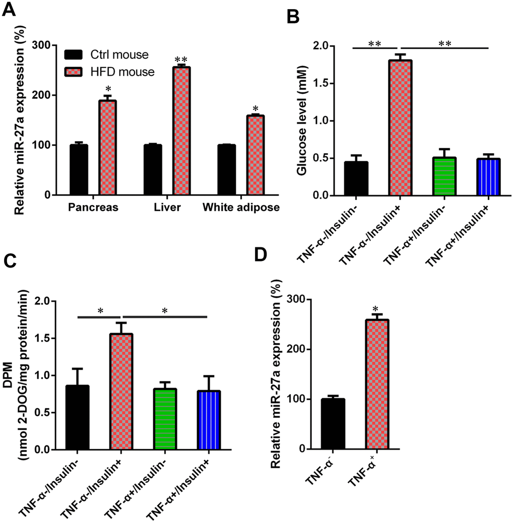 An HFD-induced obese mouse model and IR cell model were established to study the role of miR-27a expression in glucose metabolism and IR. In the obese mice, miR-27a expression in the pancreas, liver, and white adipose tissue was significantly upregulated, compared with normal control mice (Figure 1A). The generation of IR cells, obtained by pre-incubation of 3T3-L1 adipocytes with TNF-α, was confirmed after detecting glucose levels before and after the addition of insulin. As shown in Figure 1B and 1C, in the absence of TNF-α, glucose uptake was increased in the cells after adding insulin. However, no change was observed in glucose uptake after pre-incubation in TNF-α, in either the presence or absence of insulin. This suggested the successful establishment of an IR model in adipocytes. Data from qRT-PCR showed that miR-27a expression was also increased after pre-incubation in TNF-α (Figure 1D).