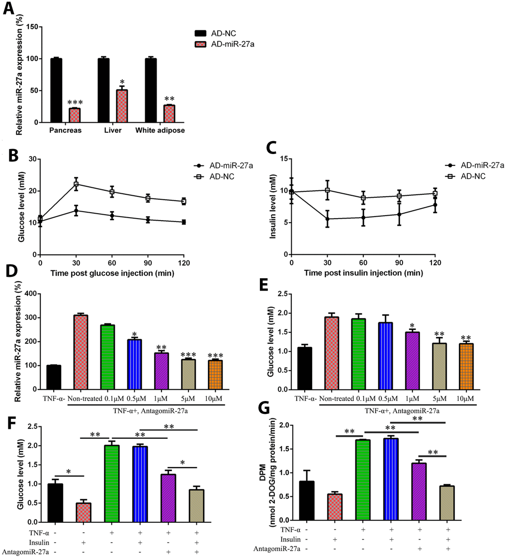 The HFD-fed mice were injected intravenously via the tail vein with a recombinant adenovirus expressing miR-27a inhibitor (AD-miR-27a) to study the function of miR-27a in glucose metabolism and IR in vivo. At first, miR-27a expression was found to be reduced in the pancreas, liver, and white adipose tissue of HFD-fed mice after AD-miR-27a injection compared with the NC group (Figure 2A). Compared with the mice treated with AD-NC, the HFD-fed mice treated with the AD-miR-27a showed a significant reduction in fasting blood glucose levels. Glucose tolerance was also remarkably increased by the reduction of miR-27a expression in a dose-dependent manner, as revealed by an oral glucose tolerance test (Figure 2B). Meanwhile, AD-miR-27a injection improved the insulin sensitivity of the obese mice, as confirmed by their steeper rate of reduced blood glucose levels in response to insulin (Figure 2C).