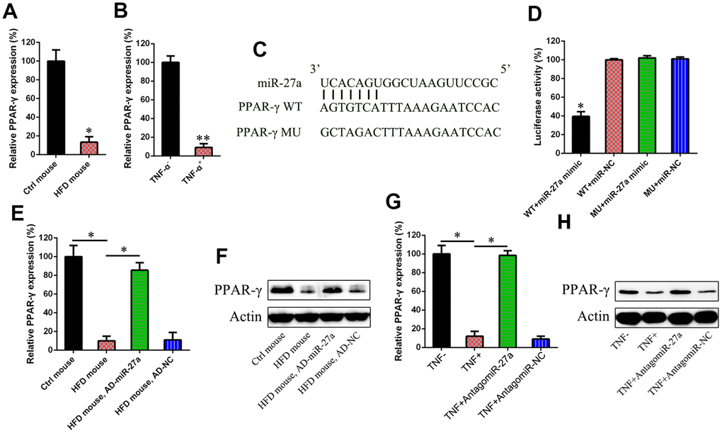 In conclusion, we reported the expression levels of miR-27a in adipocytes treated with TNF-α and in HFD-induced obese mice. MiR-27a plays a considerable role in promoting IR in both of these models, at least partially through the PPAR-γ-mediated PI3K/Akt signaling pathway. Out data suggest that miR-27a itself might be a promising target to improve IR and glucose metabolism during the progression of T2DM.