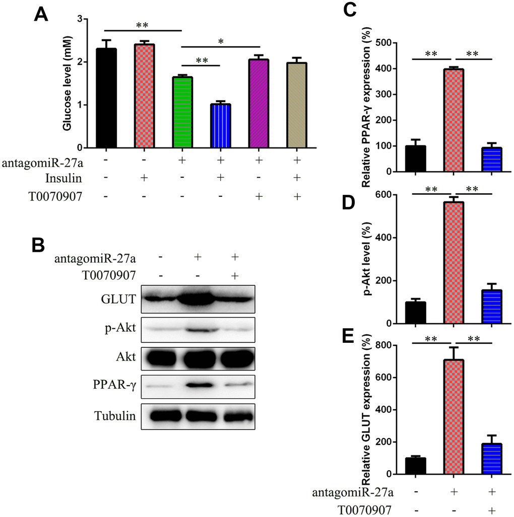 To confirm the effects of PPAR-γ on miR-27a-regulated insulin sensitivity, antagomiR-27a-transfected IR cells were treated with the PPAR inhibitor T0070907. T0070907 has been used to reduce peroxisome proliferator-activated receptor gamma (PPAR-γ) expression in lipopolysaccharide (LPS)-induced leukemia RAW264.7 cell line [29], therefore it is PPAR-γ specific inhibitor. T0070907 treatment restored the antagomiR-27a-reduced glucose levels (Figure 5A). Furthermore, T0070907 treatment reduced PPAR-γ expression, Akt phosphorylation, and GLUT4 expression induced by antagomiR-27a (Figure 5B–5E).