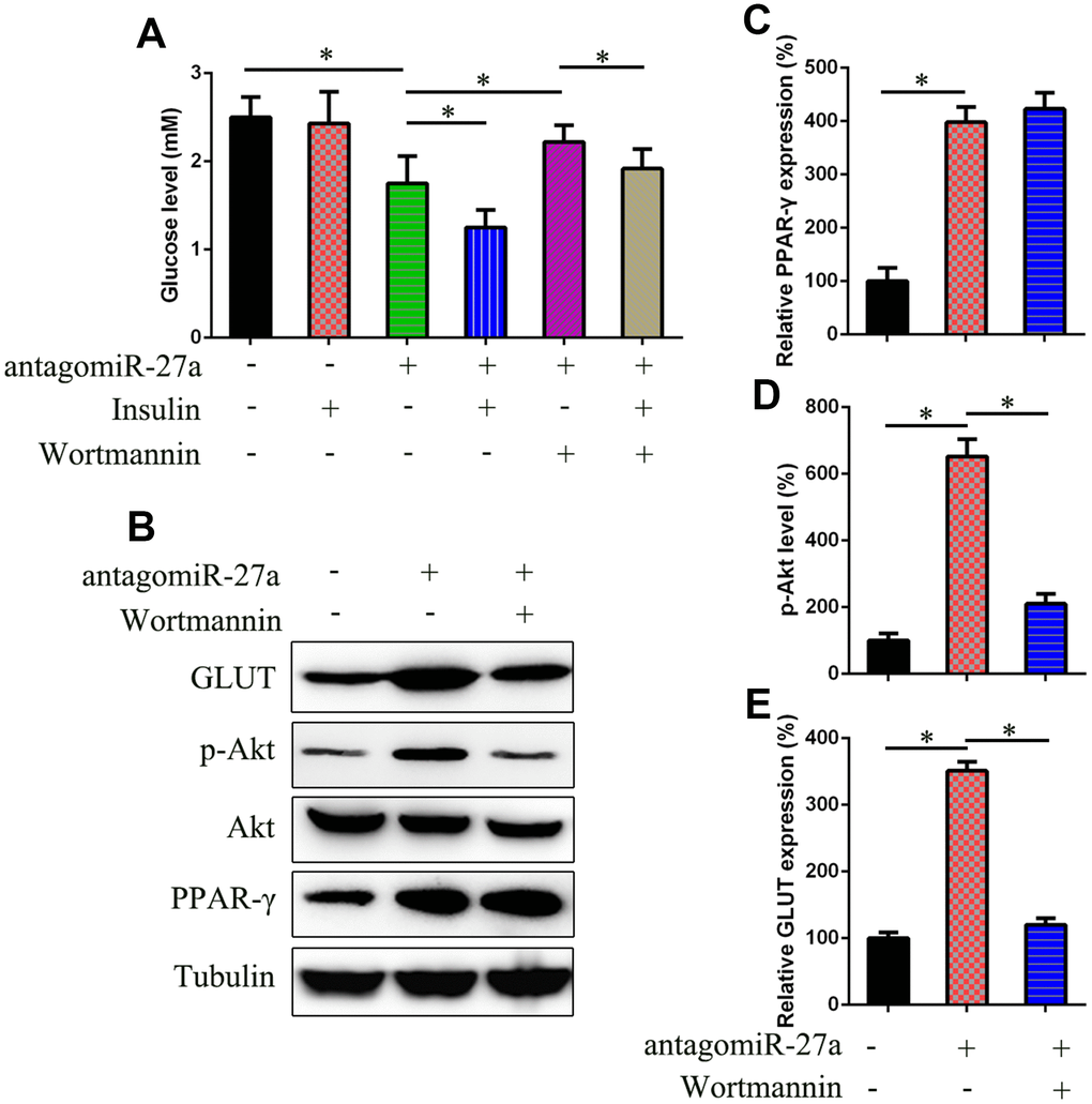 AntagomiR-27a-transfected IR cells were treated with the PI3K inhibitor wortmannin to confirm the role of PI3K/Akt signaling in miR-27a-PPAR-γ-regulated insulin sensitivity. The results showed that the reduced level of glucose induced by antagomiR-27a transfection was recovered after wortmannin treatment (Figure 6A). Additionally, there was no change in PPAR-γ expression after treatment, whereas the phosphorylation of Akt and GLUT4 expression were significantly reduced (Figure 6B–6E).