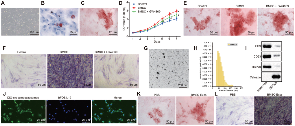 Next, BMSCs were co-cultured with human osteoblasts (hFOB1.19) using the Transwell system. The results indicated that co-culture of BMSCs and osteoblasts (hFOB1.19) could promote the proliferation of human osteoblasts (hFOB1.19) and enhance the calcified nodules as well as ALP activity. GW4869 is a vesicular secretion inhibitor, which is often applied to inhibit the secretion of exosomes. Our results demonstrated that after the addition of GW4869, the degree of promotion on human osteoblasts (hFOB1.19) by BMSCs was diminished (Figure 1D–1F). The aforementioned results demonstrated the effects of co-culture of BMSCs and osteoblasts (hFOB1.19) on the proliferation of osteoblasts (hFOB1.19) and the calcified nodules and ALP activity may be mediated by exosomes. Next, we collected and isolated exosomes from hBMSCs. transmission electron microscopy (TEM) and Tunable resistive pulse sensing (TRPS) analysis revealed that the exosomes were cup-shaped or circular, and the diameter of exosome was 50–150 nm (81.7 ± 17.9) (Figure 1G–1H). Western blot analysis provided evidence indicating that the BMSC-Exos exhibited expression of the exosome markers CD63, CD9 and HSP70 without the expression of Calnexi (Figure 1I), suggesting that we had indeed isolated exosomes. In order to evaluate the ability of BMSCs-derived exosomes to enter human osteoblast hFOB1.19, the exosomes labeled by Dio (green) were co-cultured with human osteoblasts (hFOB1.19) at 37°C for 24 h and then analyzed under a confocal microscope. Our findings revealed that the exosome was endocytosed by osteoblasts (hFOB1.19) (Figure 1J). In order to further verify the effect of co-culture on the proliferation of osteoblasts (hFOB1.19), the calcified nodules as well as the ALP activity was mediated by the exosomes. The isolated BMSCs-derived exosomes were used to treat human osteoblasts (hFOB1.19). The results of alizarin red and ALP staining illustrated that there were more calcified nodules and higher ALP staining intensity in osteoblasts (hFOB1.19) treated with BMSC-Exos than that treated with PBS (Figure 1K–1L). Collectively, the results suggest that hBMSCs promote the activity of osteoblasts (hFOB1.19) through the mediation of exosomes.