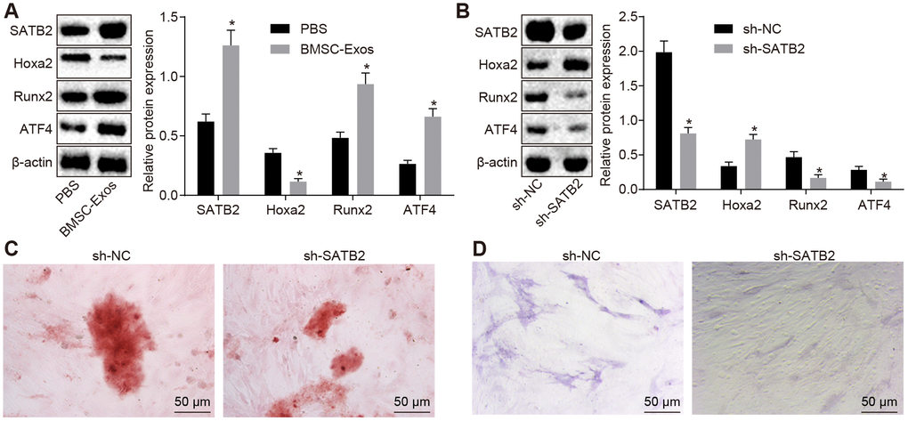 Previous reports have indicated that the expression of SATB2 in osteoblasts acts to aid in the regulation of osteoblast differentiation [19]. In order to investigate whether the effect of BMSC-Exos on osteoblasts was completed by altering SATB2, Western blot analysis was conducted on osteoblasts (hFOB1.19). Compared with osteoblasts (hFOB1.19) treated with PBS, the protein expression of SATB2, Runx2 and ATF4 was significantly increased while the Hoxa2 protein expression was markedly decreased in the osteoblasts (hFOB1.19) treated with BMSC-Exos (Figure 2A). Next, we set out to further explore the role of SATB2 in osteoblasts, hFOB1.19 was then treated with SATB2 knockdown. The results demonstrated that the protein expression of SATB2, Runx2 and ATF4 was notably reduced, while the protein expression of Hoxa2 was considerably elevated in the osteoblasts (hFOB1.19) treated with si-SATB2. In addition, the results of alizarin red staining and ALP staining indicated that calcified nodules were decreased, in addition to a decrease in the ALP staining intensity in the osteoblasts (hFOB1.19) treated with sh-SATB2 (Figure 2B–2D), all of which suggested that silencing SATB2 could inhibit the osteogenic ability of osteoblasts.